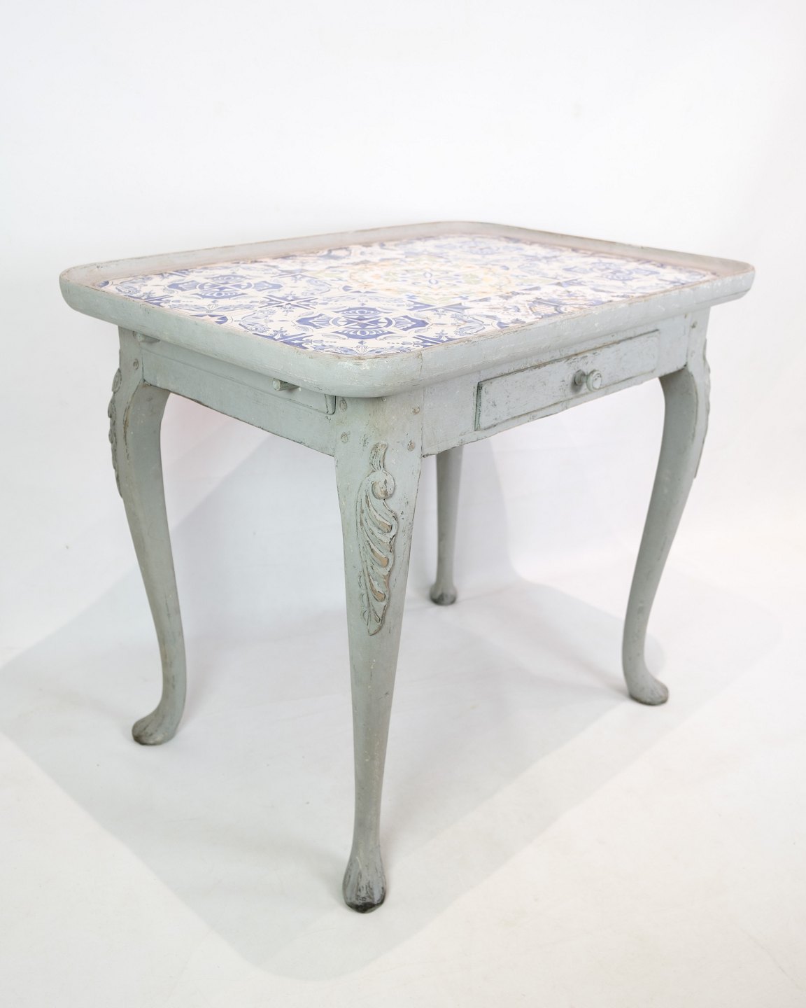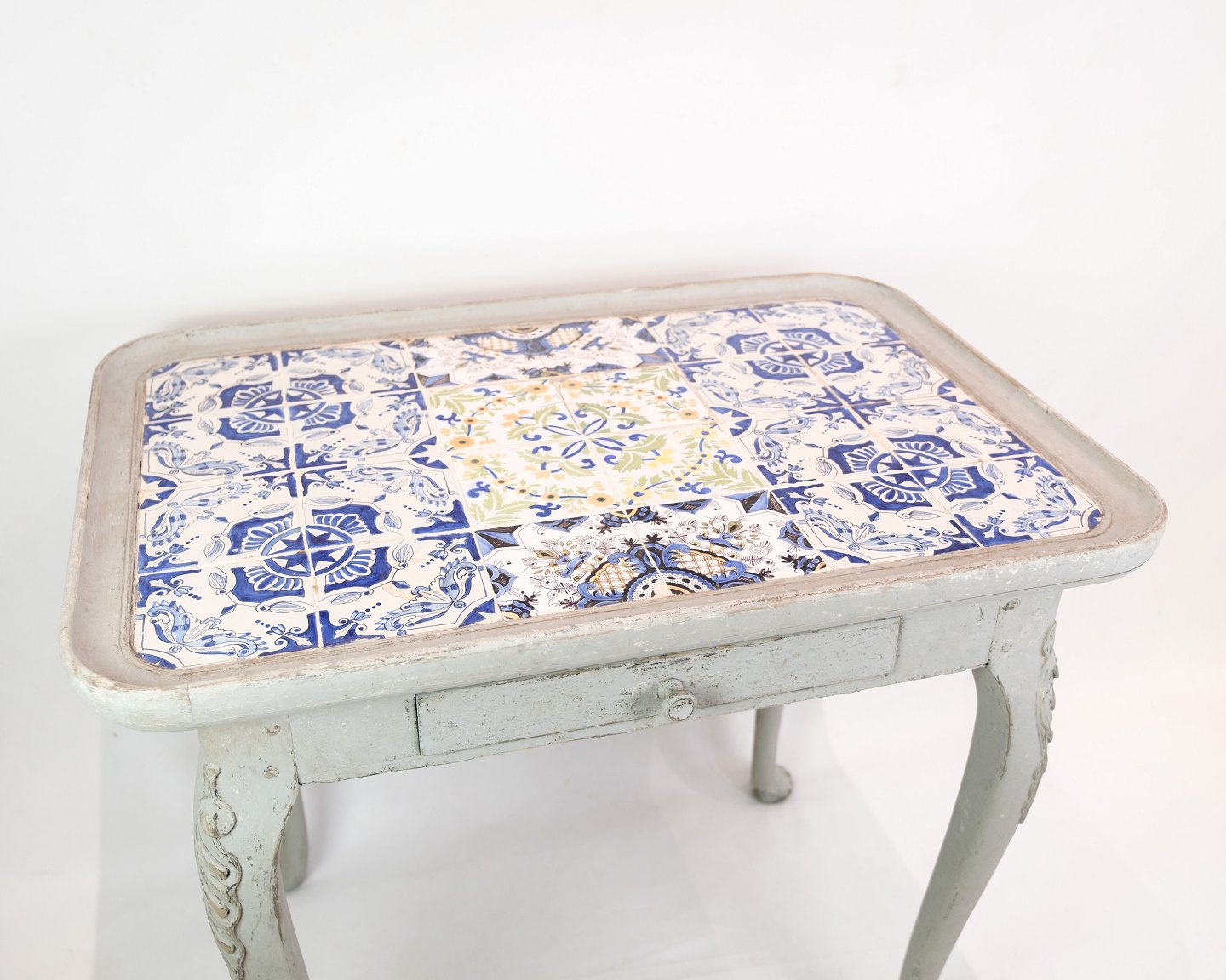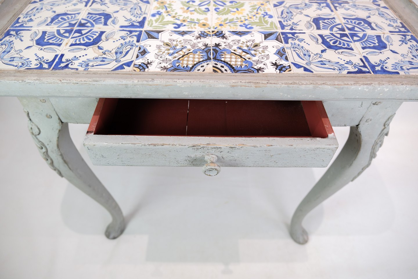 The rococo tile table, painted gray and dated 1780, is a charming example of classic furniture design. Its elegantly curved forms and refined detailing are characteristic of the period and add a historical charm to any room. This timeless piece of furniture is a beautiful and functional addition to any interior with its unique aesthetic and historical value.