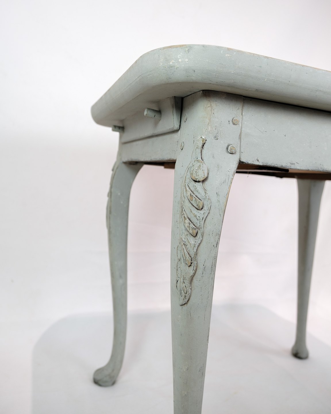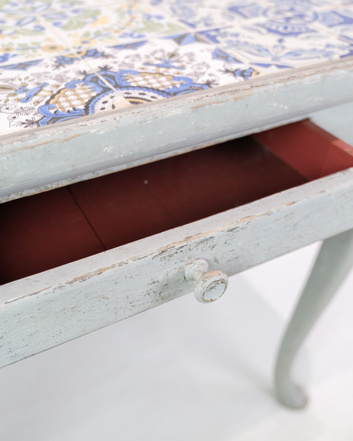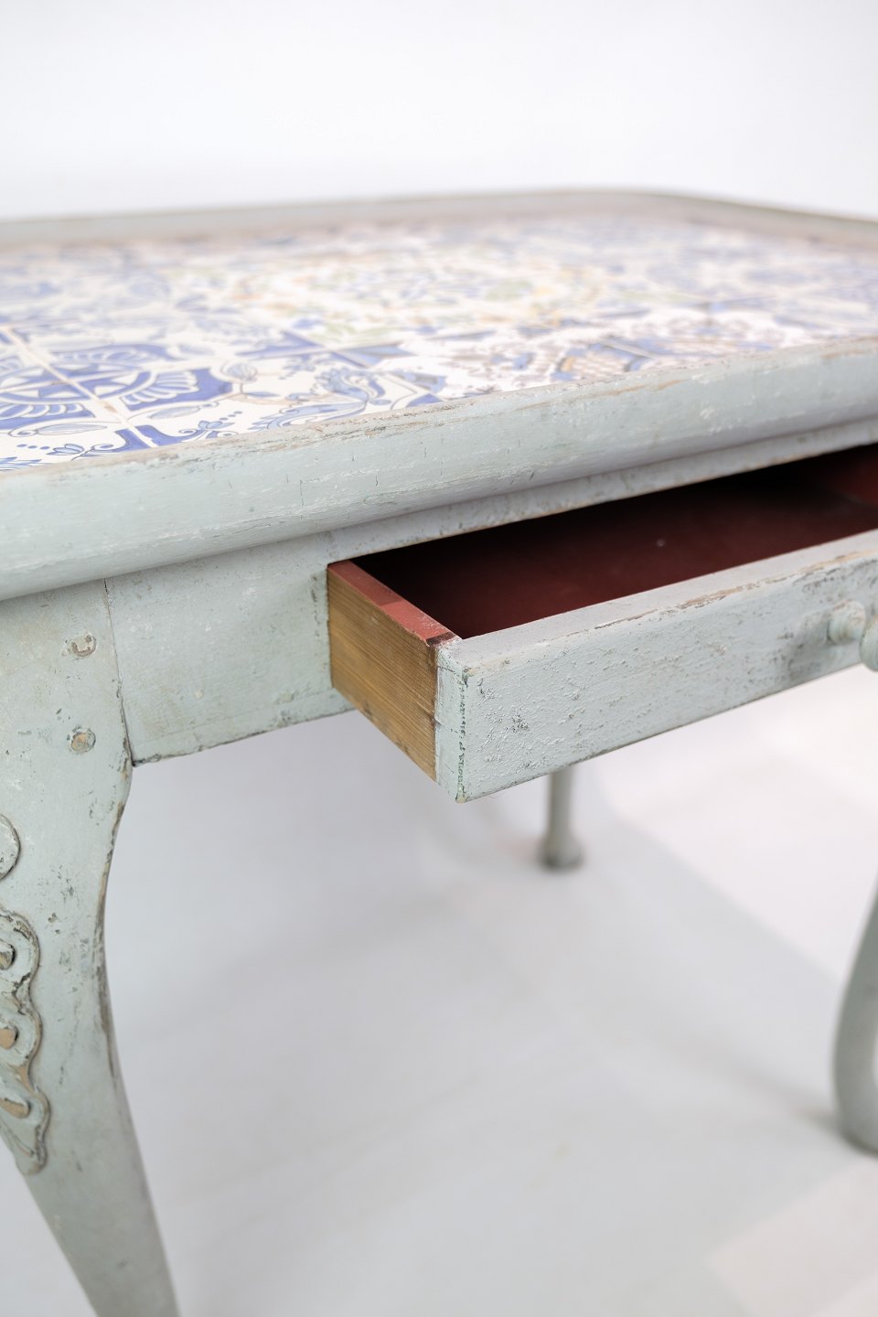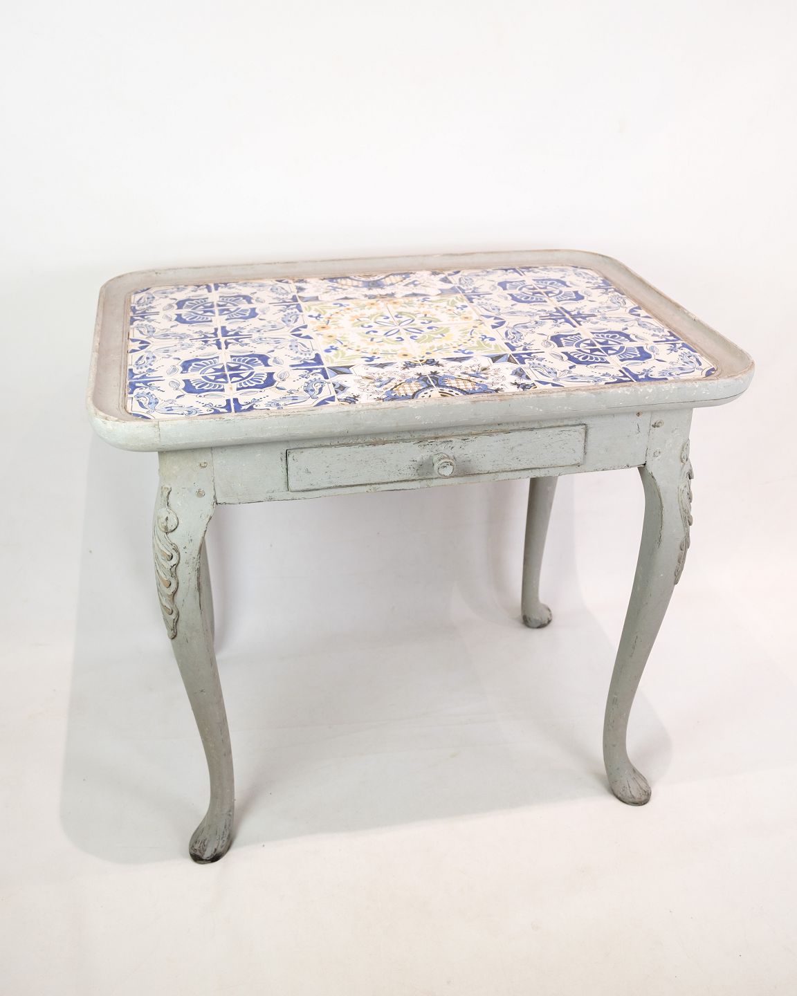 The rococo tile table, painted gray and dated 1780, is a charming example of classic furniture design. Its elegantly curved forms and refined detailing are characteristic of the period and add a historical charm to any room. This timeless piece of furniture is a beautiful and functional addition to any interior with its unique aesthetic and historical value.