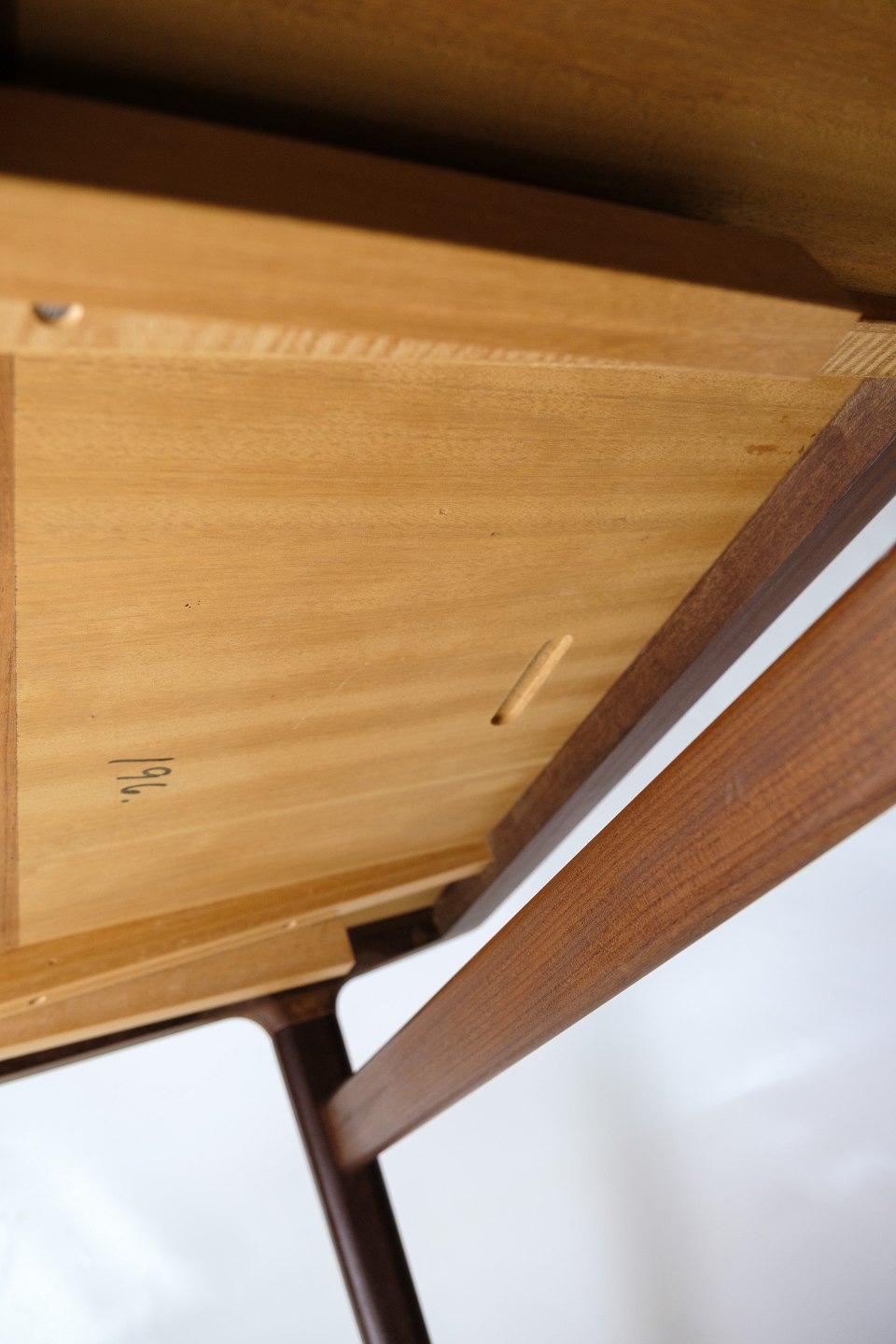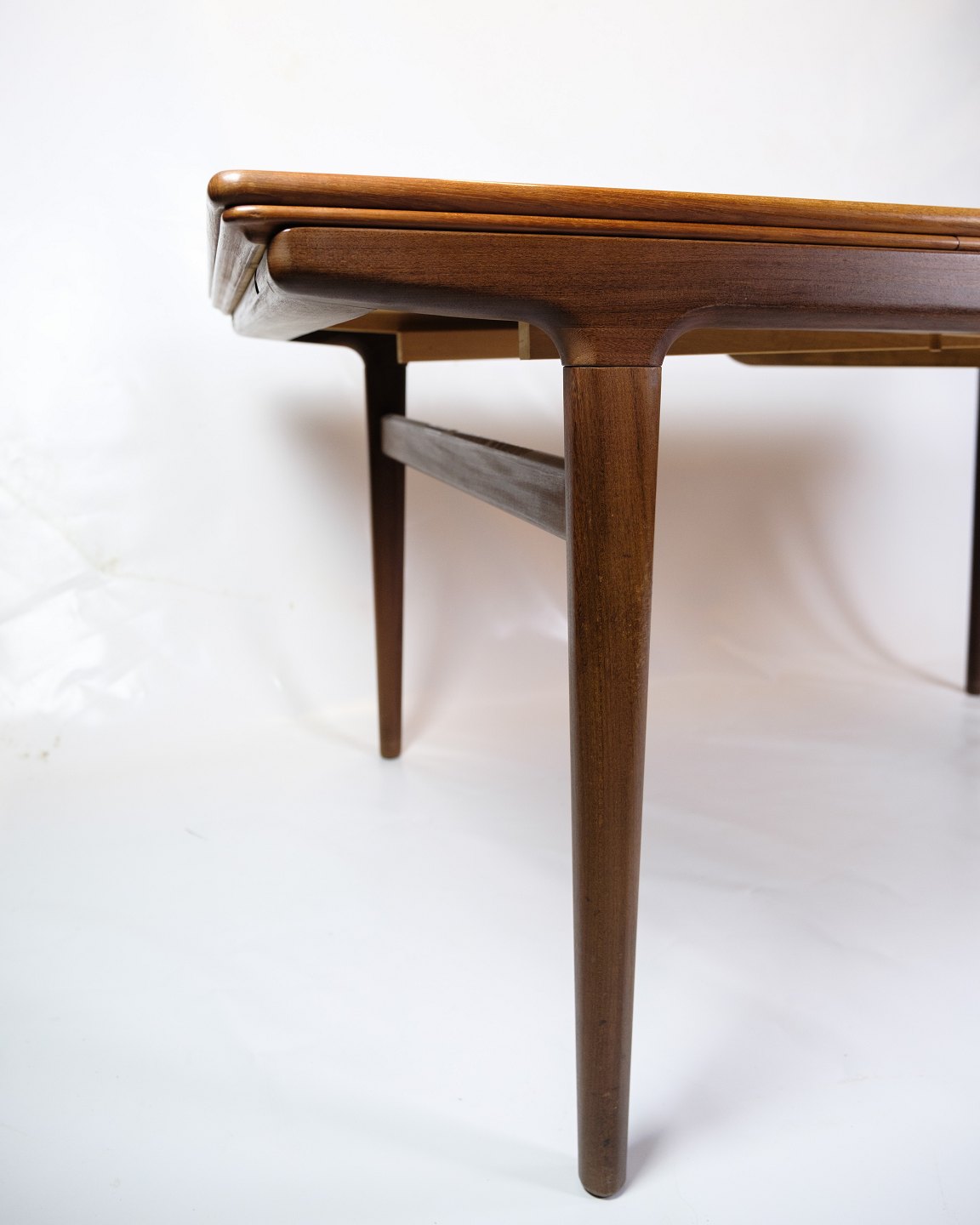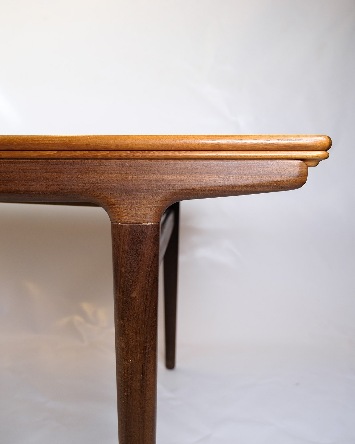 The teak dining table, created by the talented furniture designer Johannes Andersen and manufactured by Uldum Møbelfabrik in 1960, is an impressive piece of Danish furniture art. With its elegant design and craftsmanship, it makes a beautiful and functional addition to any dining area.