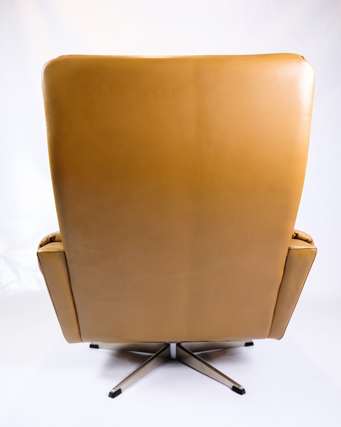 The armchair in brown leather, an example of Danish design from the 1980s, radiates both comfort and style. The deep, warm color of brown leather gives the chair a sophisticated look, while the soft leather adds a luxurious feel to any decor.