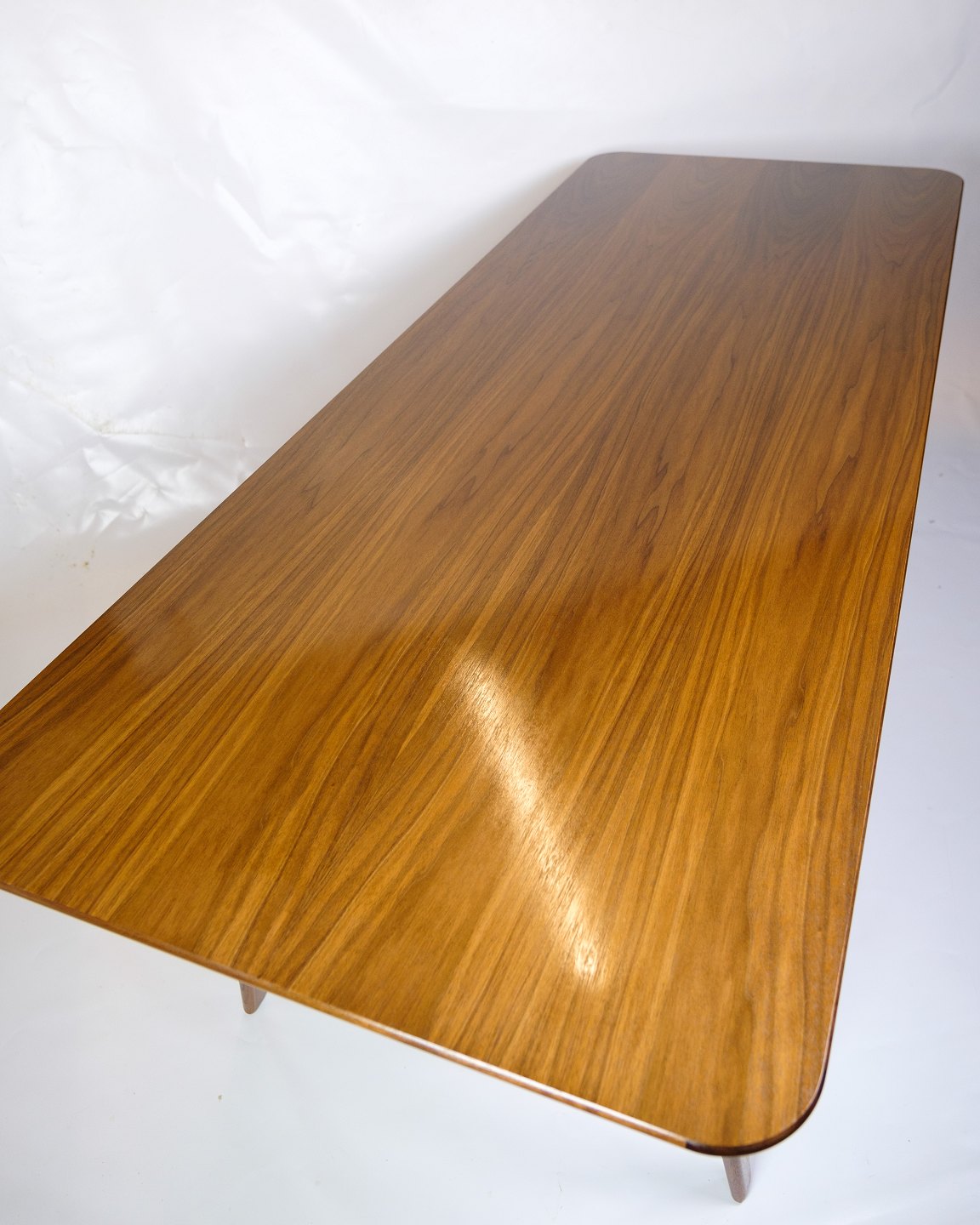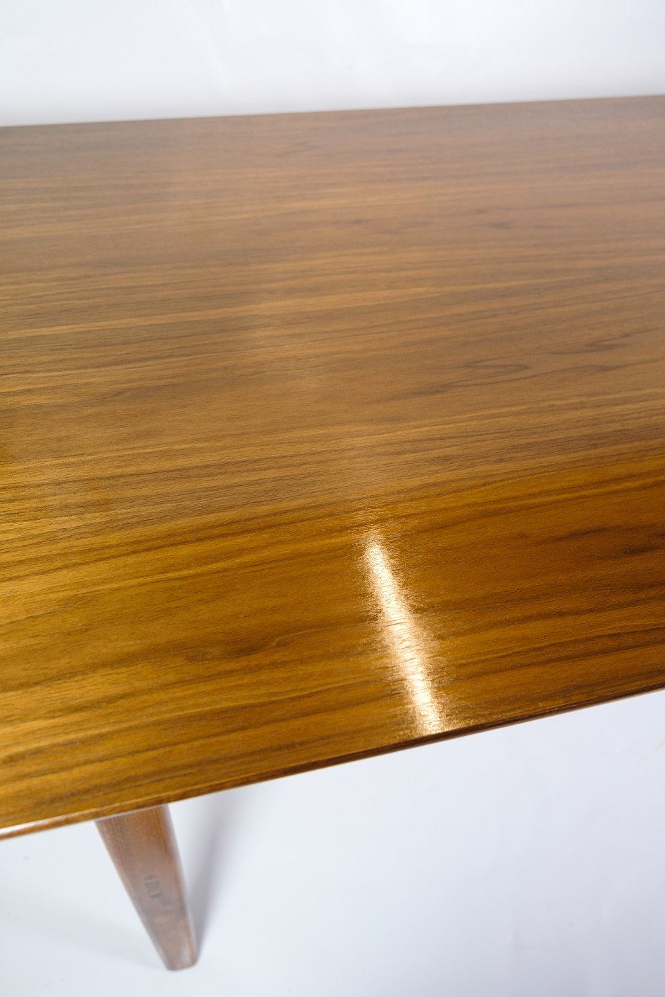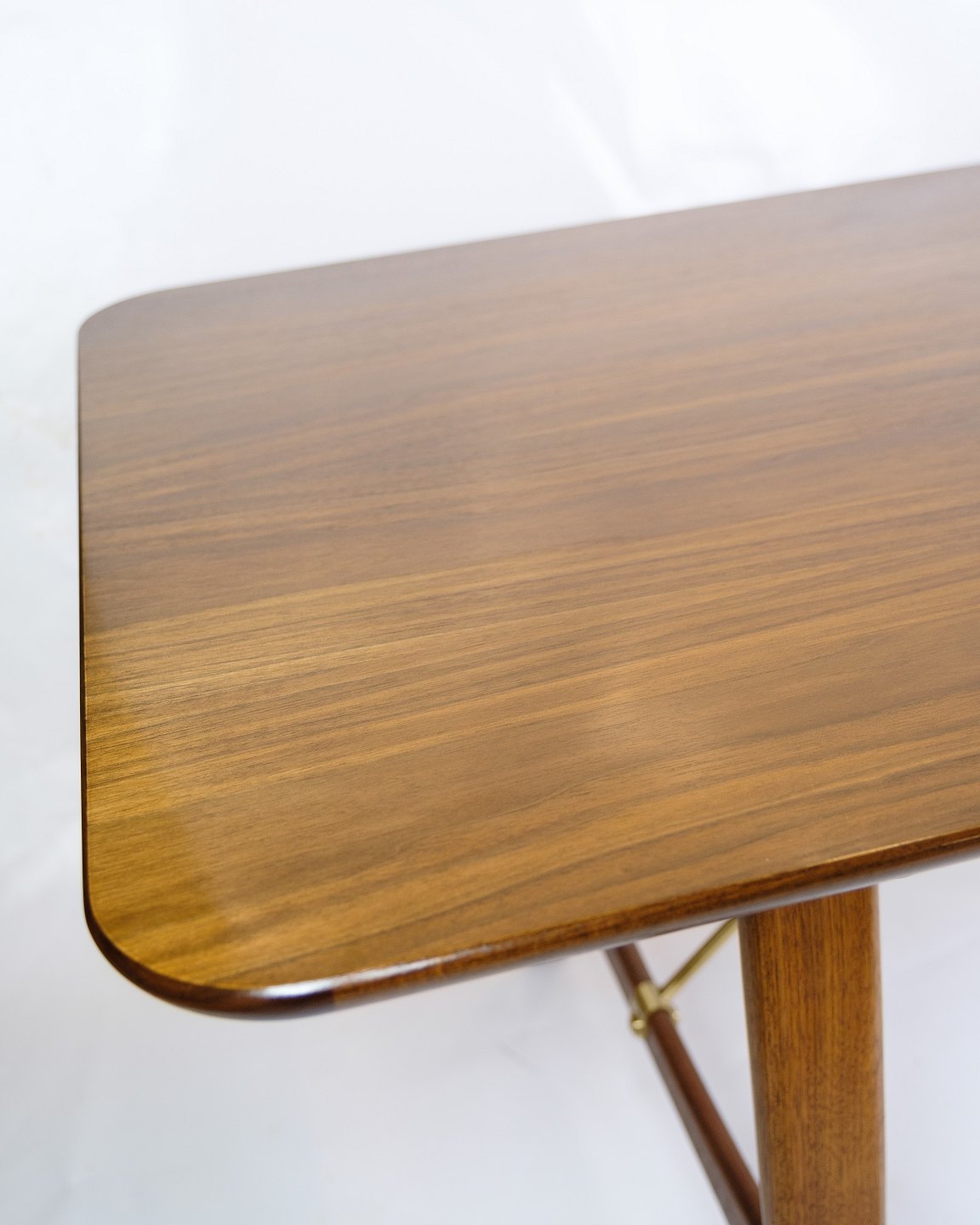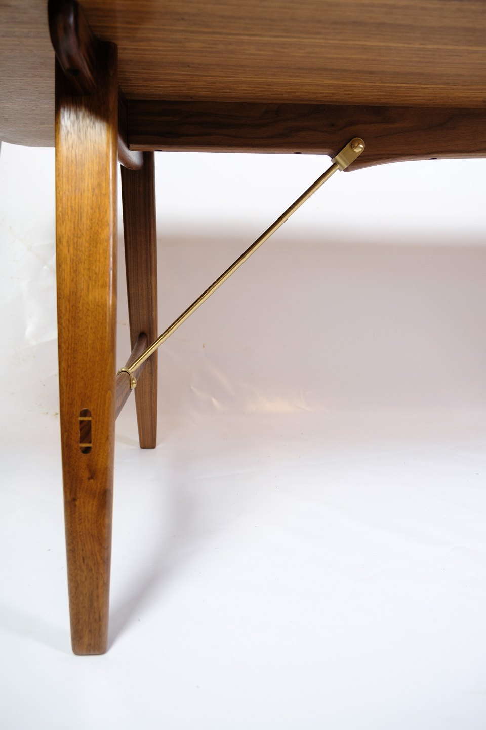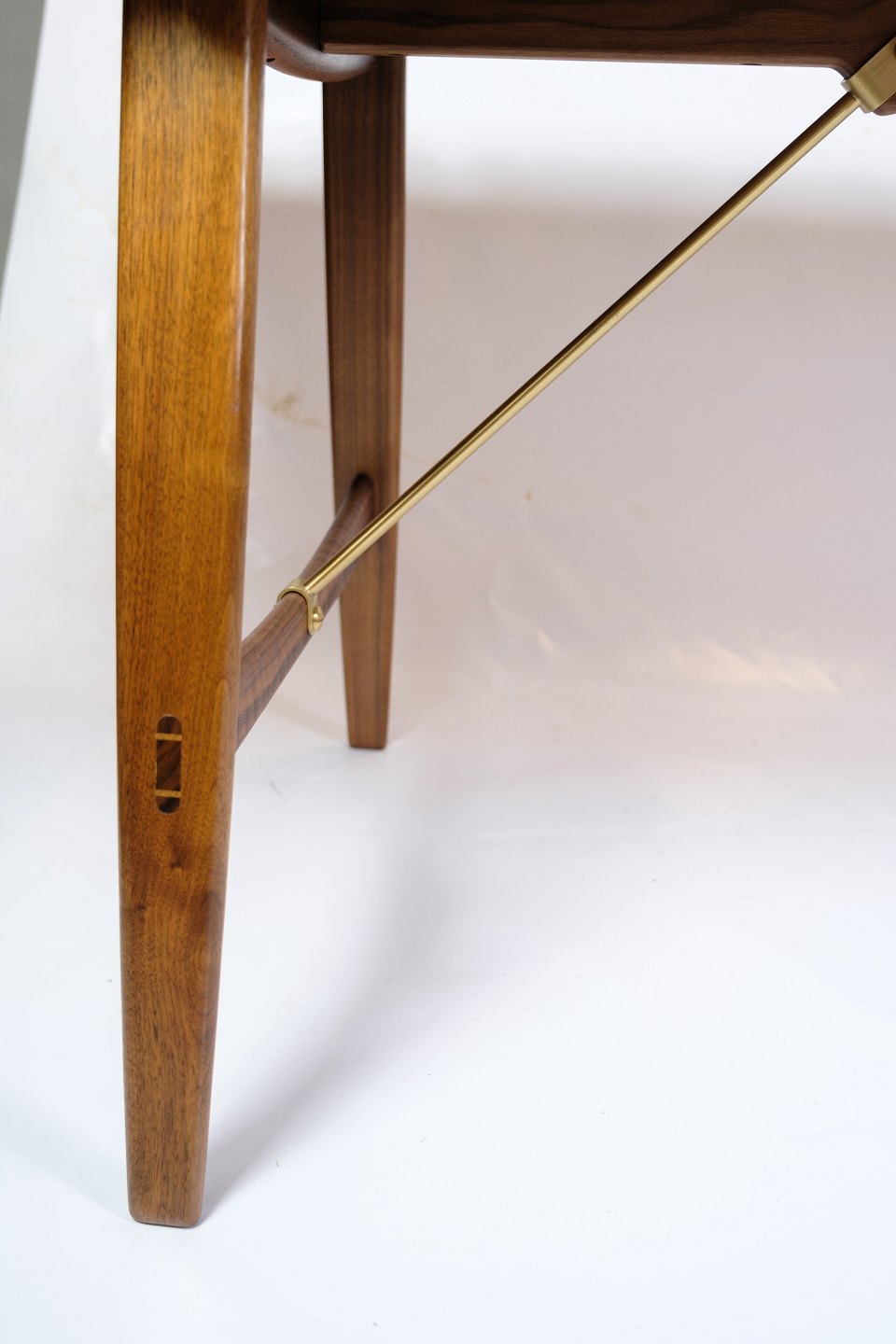 The hunting table, known as Model BM1160, is a splendid example of Børge Mogensen's unique design aesthetic. Made of walnut wood and supported by brass crossbars, this table exudes elegance and functionality.