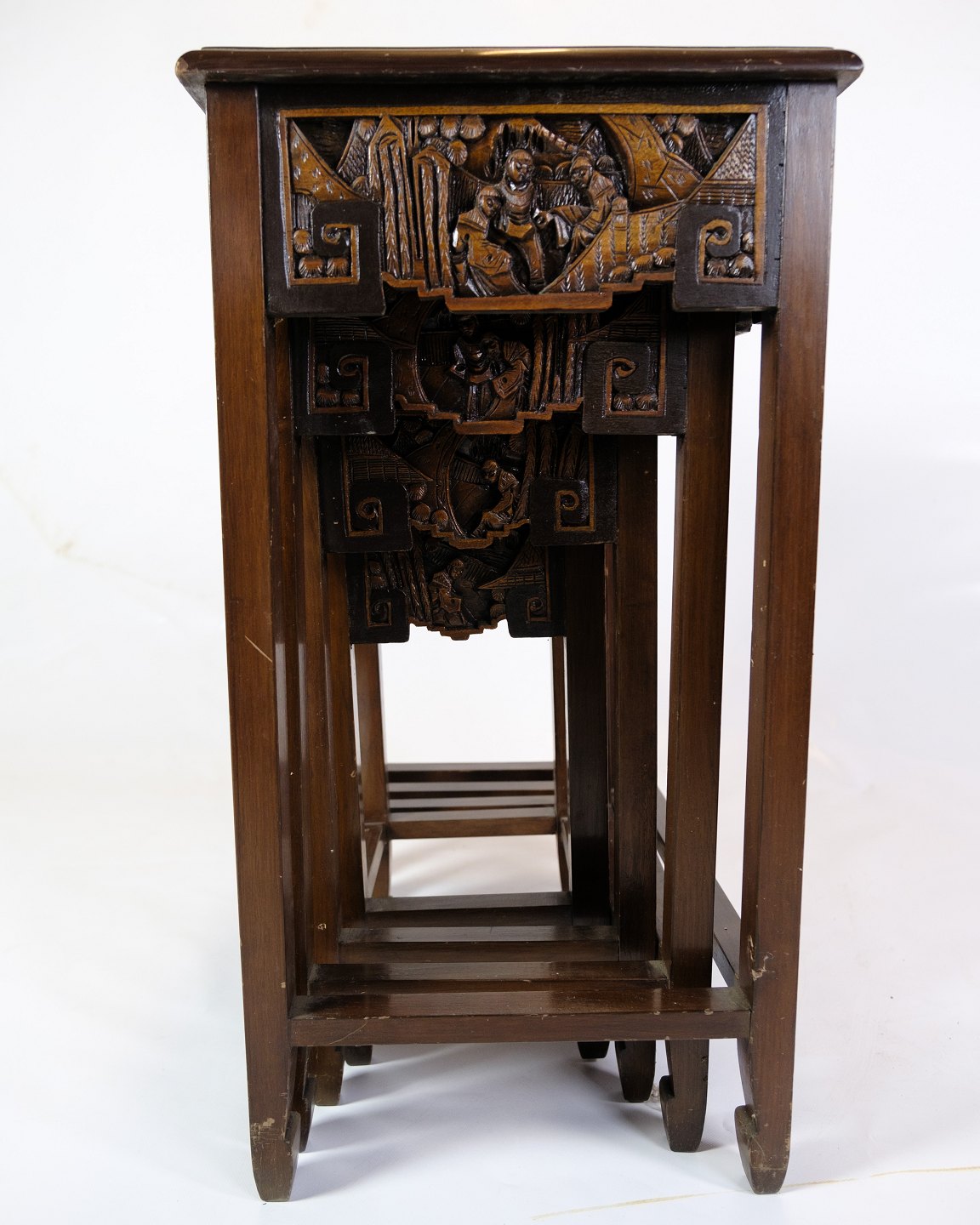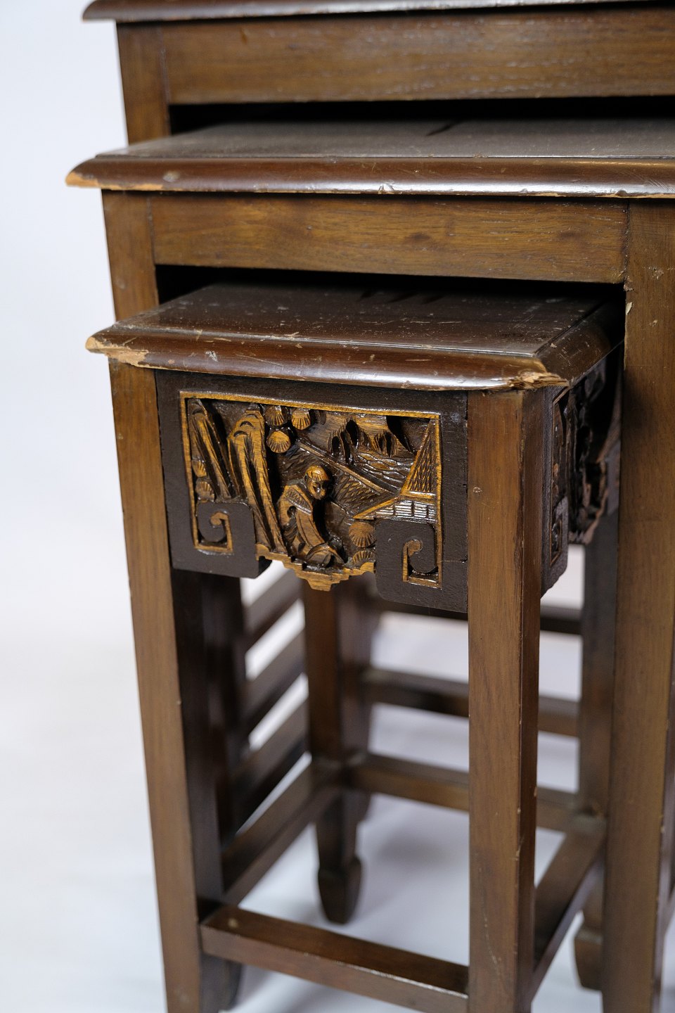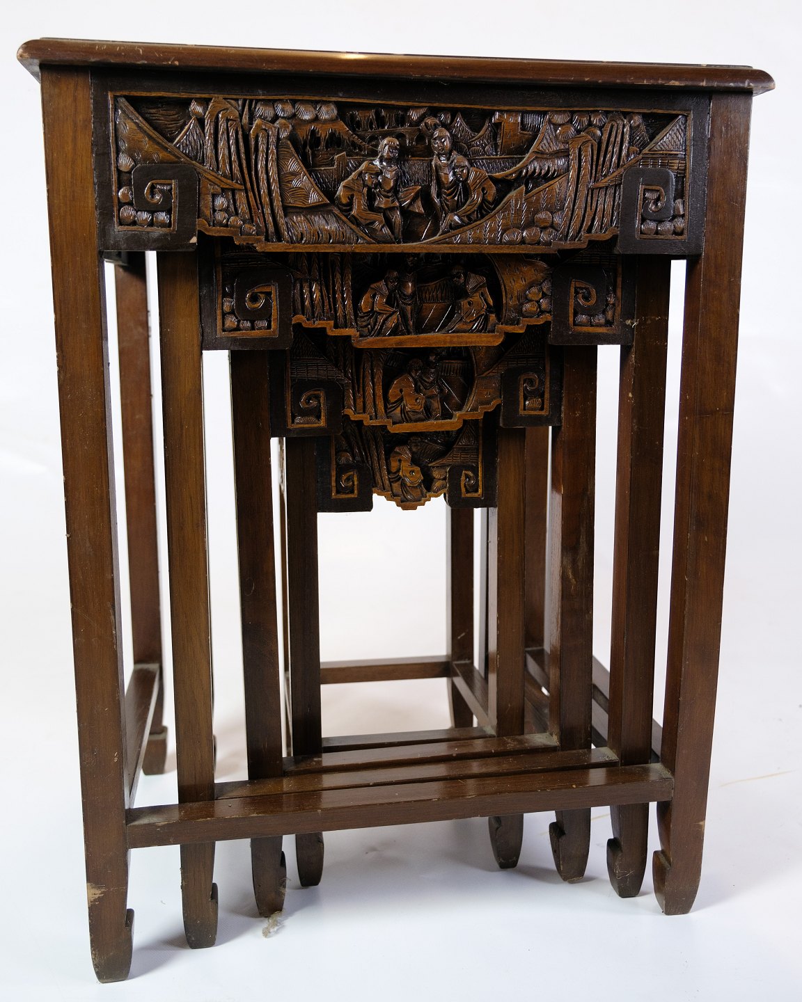 Each table is beautifully decorated with different motifs that tell stories from the culture and traditions of the Far East. These intricately carved details add depth and character to each table, making them both practical pieces of furniture and works of art in their own right.