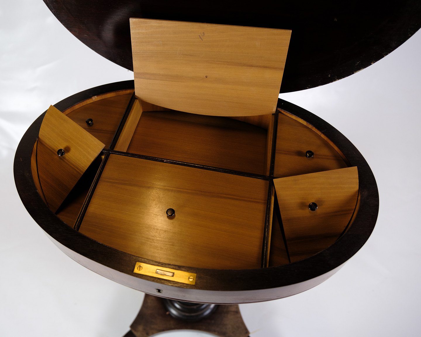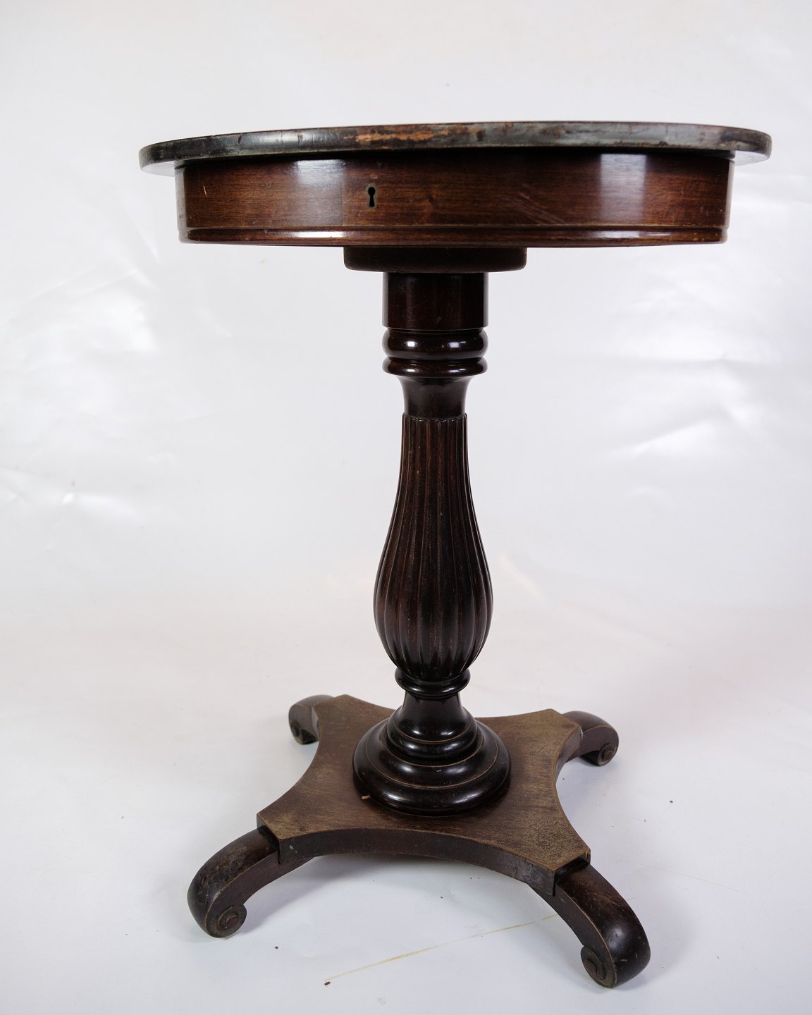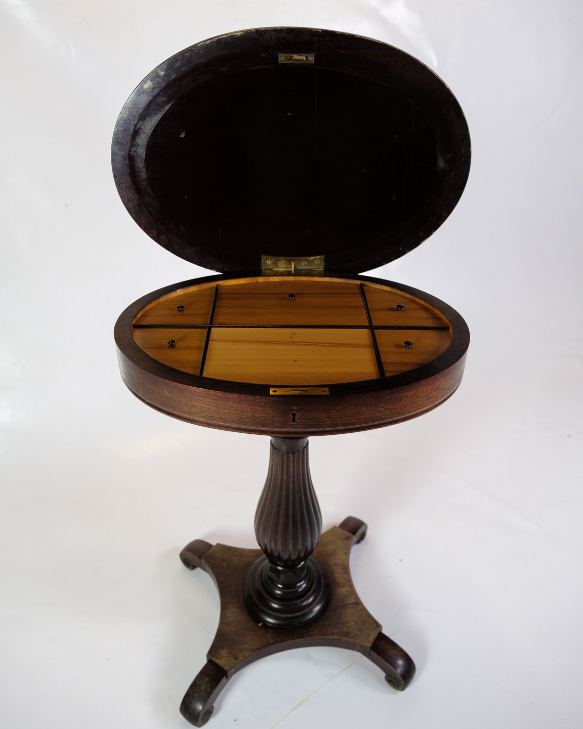 The most notable feature of this side table is its unique function as a sewing table, complete with a sewing compartment integrated into the design. This functional detail testifies to the furniture's history and its original purpose as a practical piece of furniture for crafting and storage.