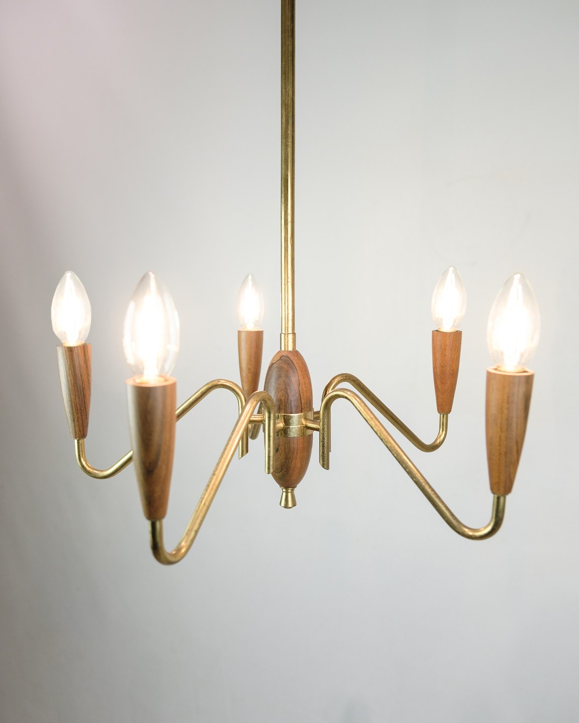 Den smukke kombination af teak og messing skaber en varm og indbydende atmosfære, samtidig med at den tilføjer et strejf af luksus til ethvert rum. Lysekronens design med fem arme giver en generøs belysning, der spreder sig jævnt og skaber en behagelig stemning i rummet.