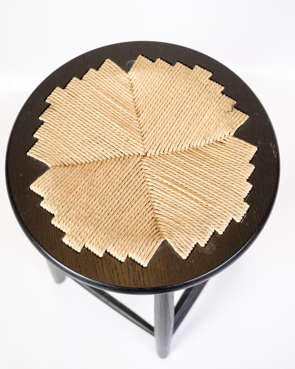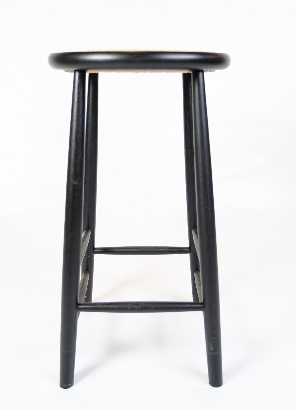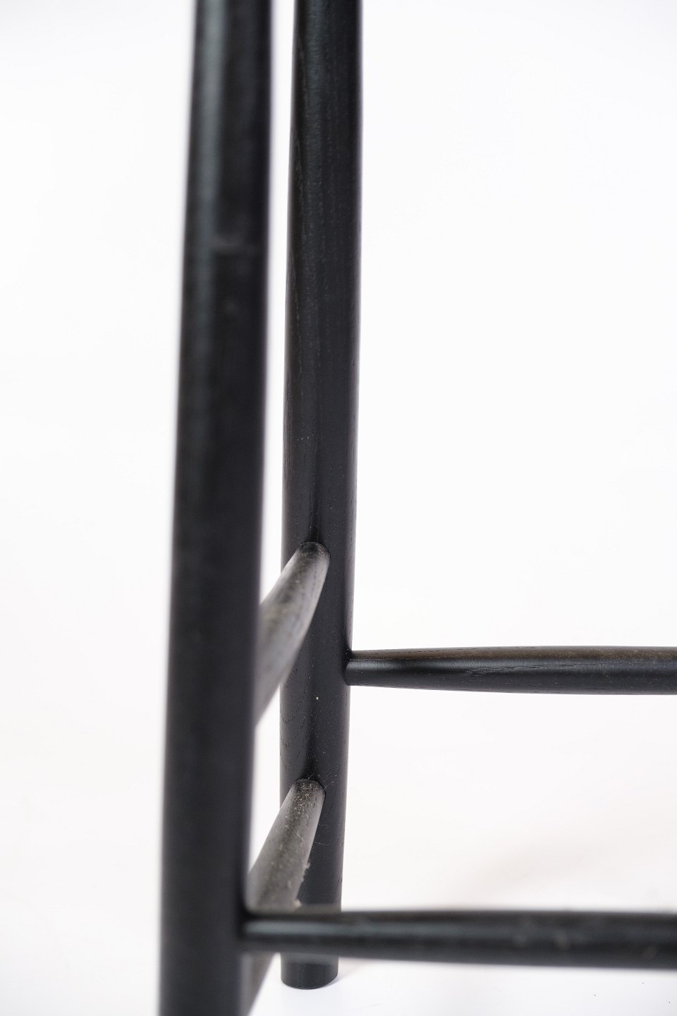 Stolens ramme er fremstillet af sort lakeret træ, der giver den et slankt og stilfuldt udseende. Sædet er flettet, hvilket tilføjer tekstur og varme til det overordnede design. Denne kombination af materialer og konstruktion resulterer i en barstol, der både er holdbar og behagelig at sidde på.