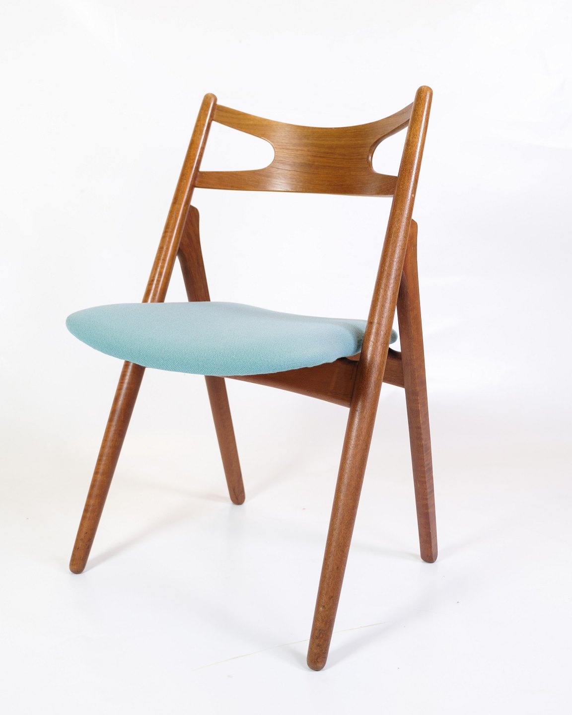 This set of six dining room chairs, model CH29P, is made of teak wood and has a timeless elegance that fits perfectly in any dining area. The chairs are carefully upholstered in light blue fabric that adds a pleasant contrast to the warm wood.