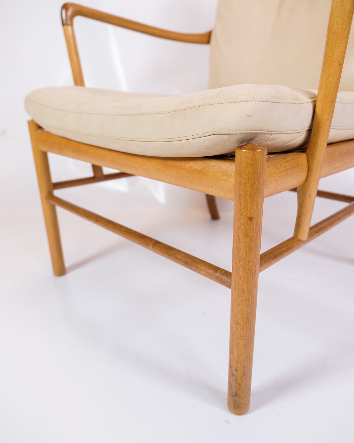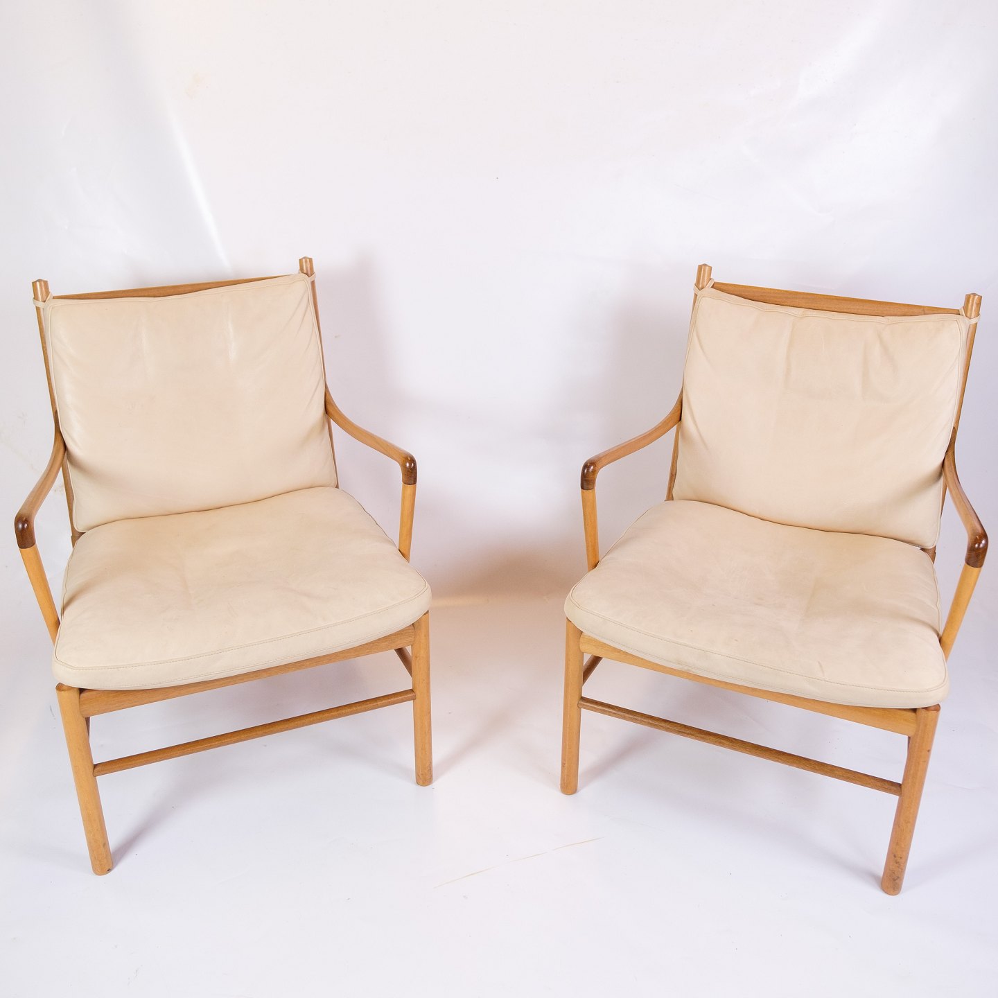 SoldThis set of two Colonial armchairs with ottoman, model OW 149, designed by Ole Wanscher and manufactured by P. Jeppesen Møbelfabrik in the 1960s, is an excellent example of mid-20th century Danish design. The chairs and stools are made of light mahogany and upholstered in light leather, which gives them an elegant and timeless look.