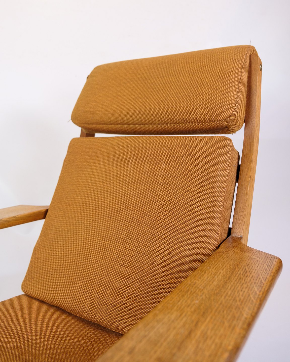 The cover is made of yellow fabric, which gives the chair a fresh and modern look. The light color creates a beautiful contrast to the oak and adds a pop of color to any decor. The fabric is chosen for its durability and comfort, which ensures that the chair remains comfortable and attractive over time.
