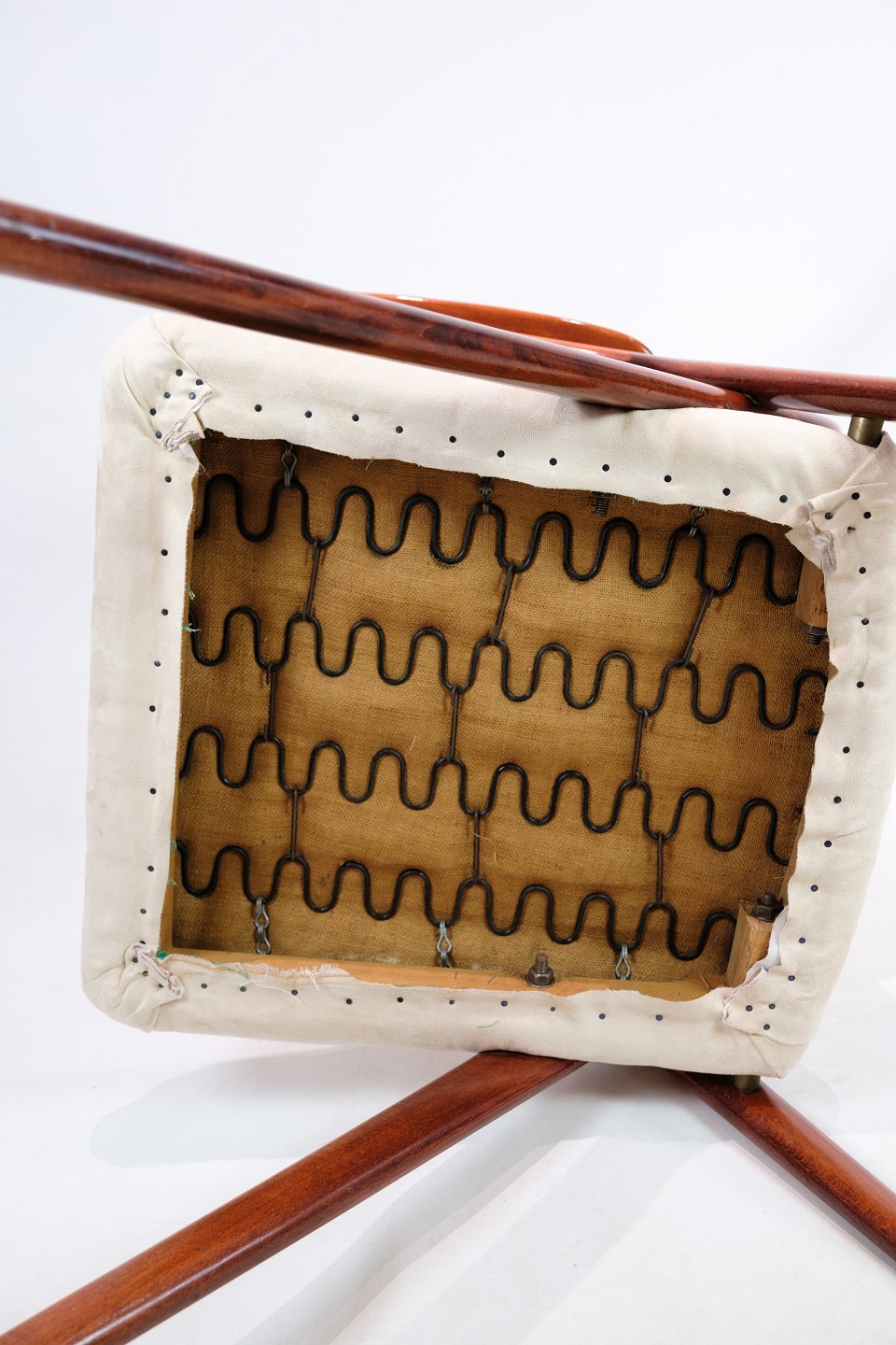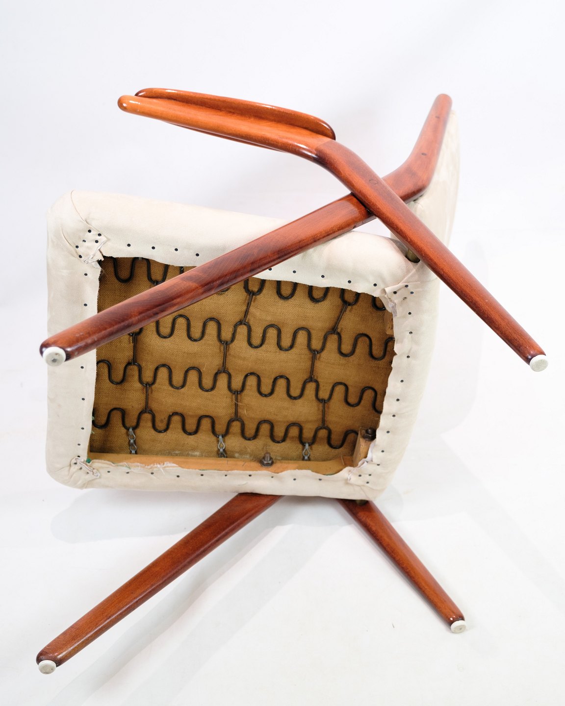 Lænestol udført i poleret mørkt træ polstret med lyst stof af den bedste kvalitet. Stolen er designet af en dansk designer ved navn Arne Hovmand-Olsen fra 1960'erne. Arne Hovmand-Olsen var en Dansk Møbelarkitekt og kom i 1938 i lære hos P. Olsen Siabast inden han i begyndelsen af 1950'erne begyndte at designe sine egne stole med stor succes. Han stole er i dag meget eftertragtet både nationalt og internationalt.