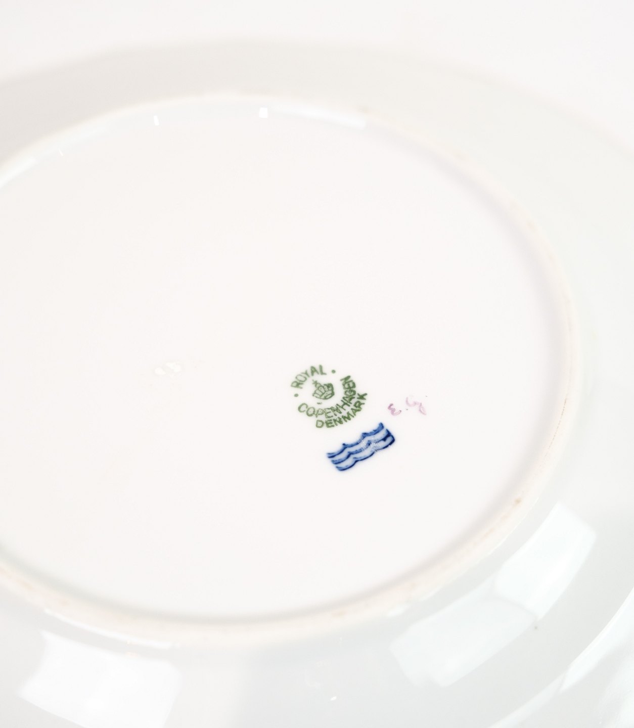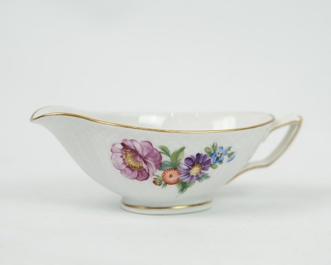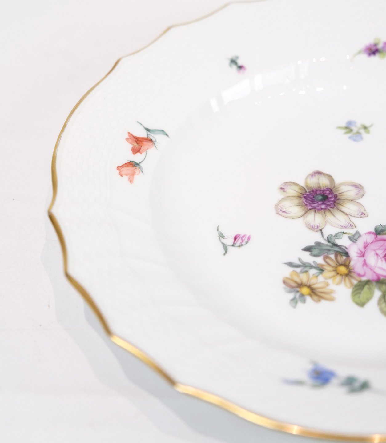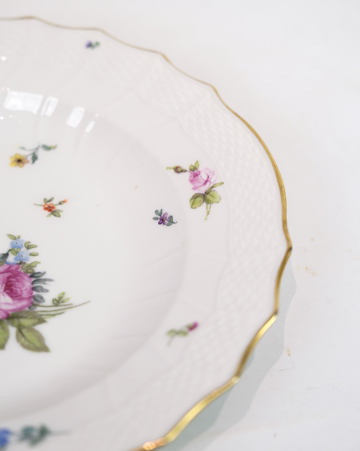 Royal porcelain dinner plates with patterned Saxon flower decorated on the edge with gold. Manufactured by Royal Copenhagen in approx. 1923, where all their goods have been hand painted and subsequently become very rare. The plates are free of flaws or defects.