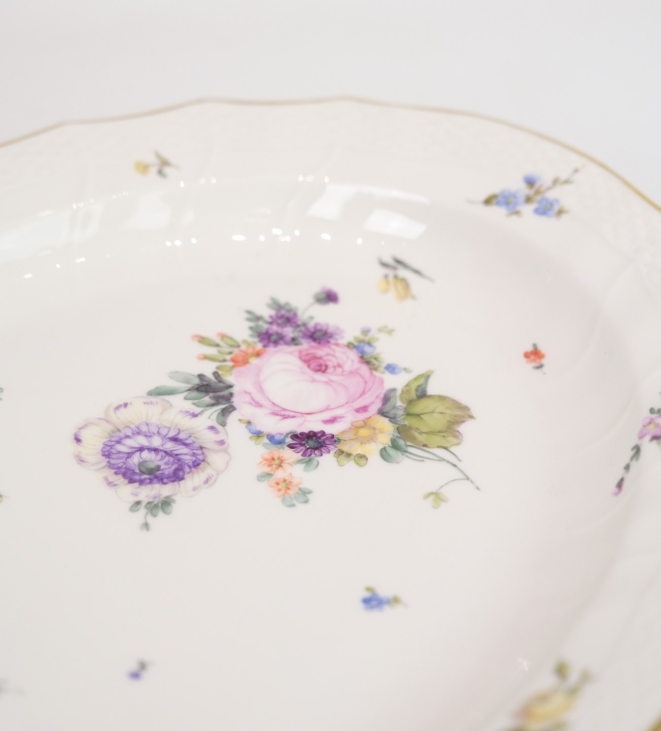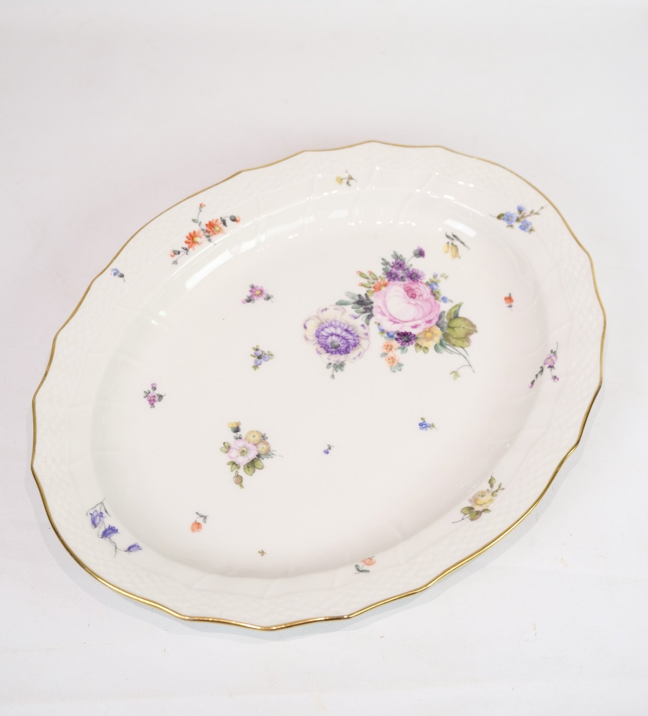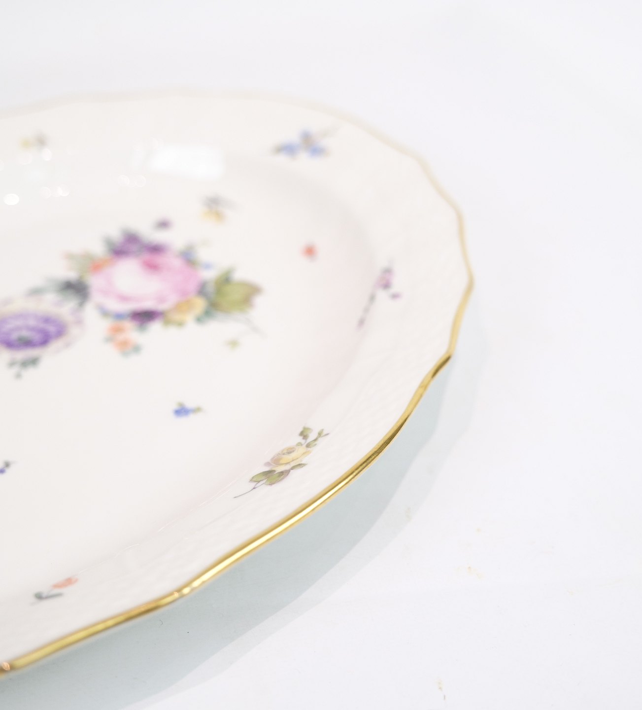 Dish of Royal porcelain with patterned Saxon flower decorated on the edge with gold. Manufactured by Royal Copenhagen in approx. 1923, where all their goods have been hand painted and subsequently become very rare. The dish is without flaws or defects.