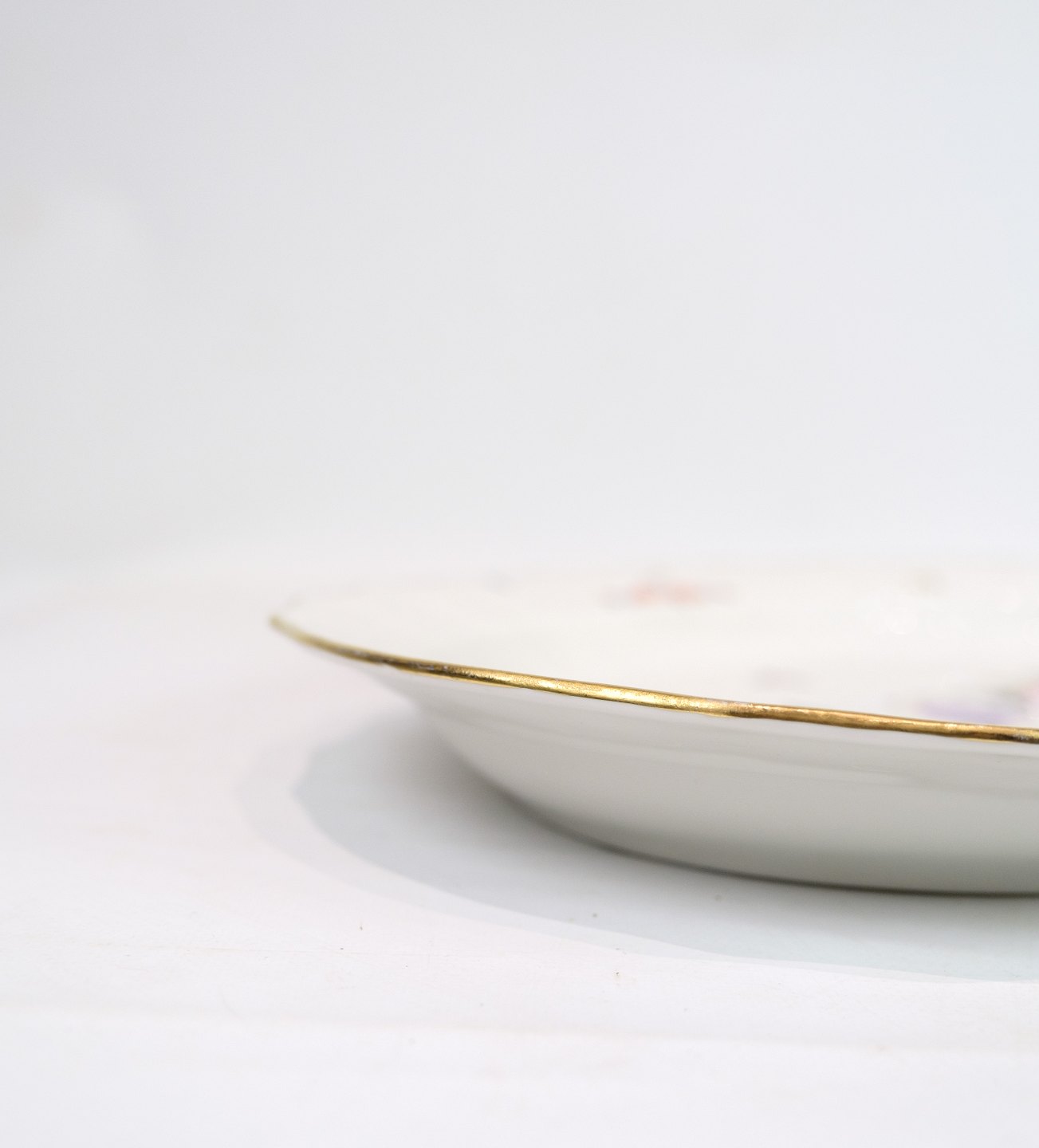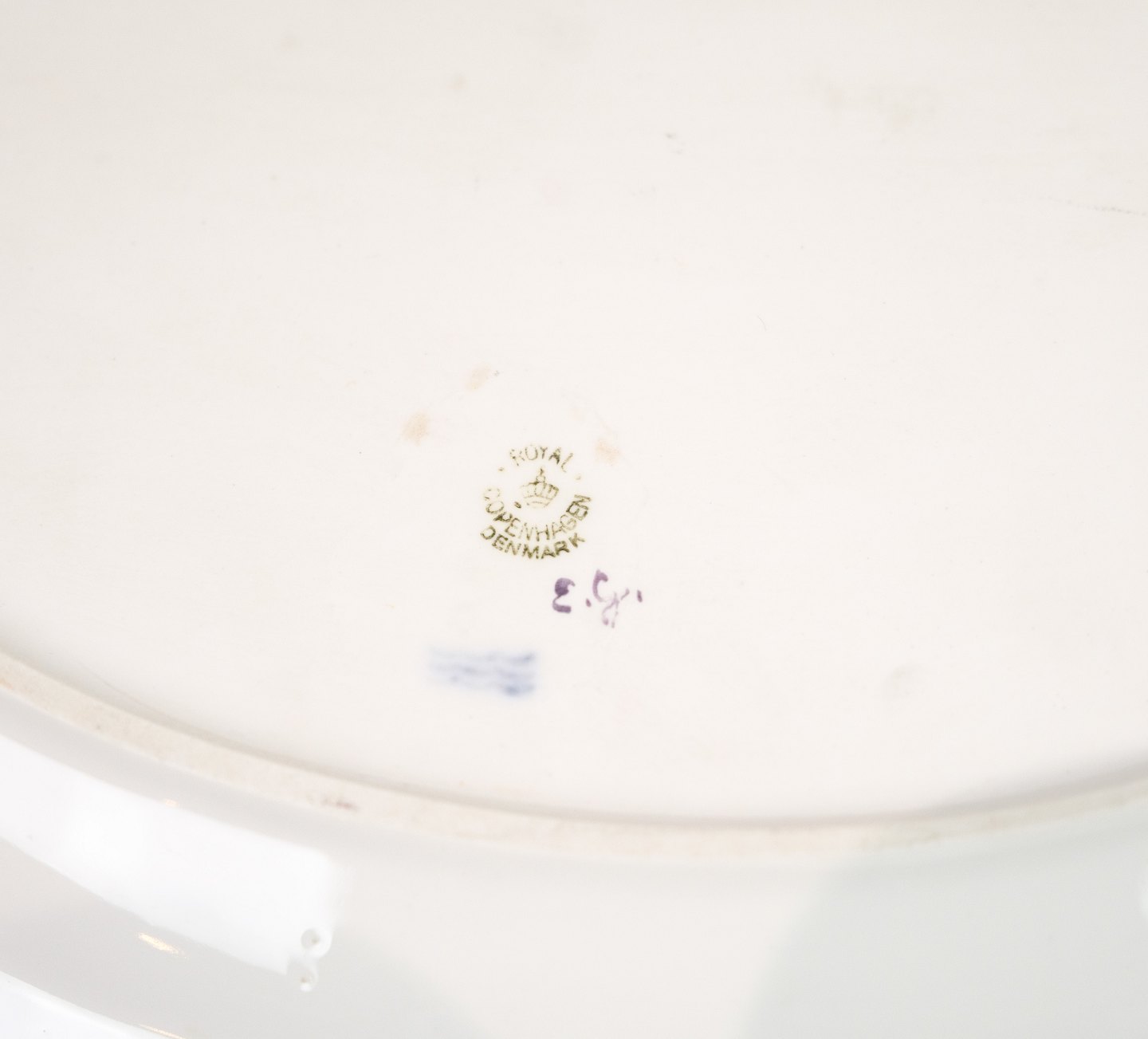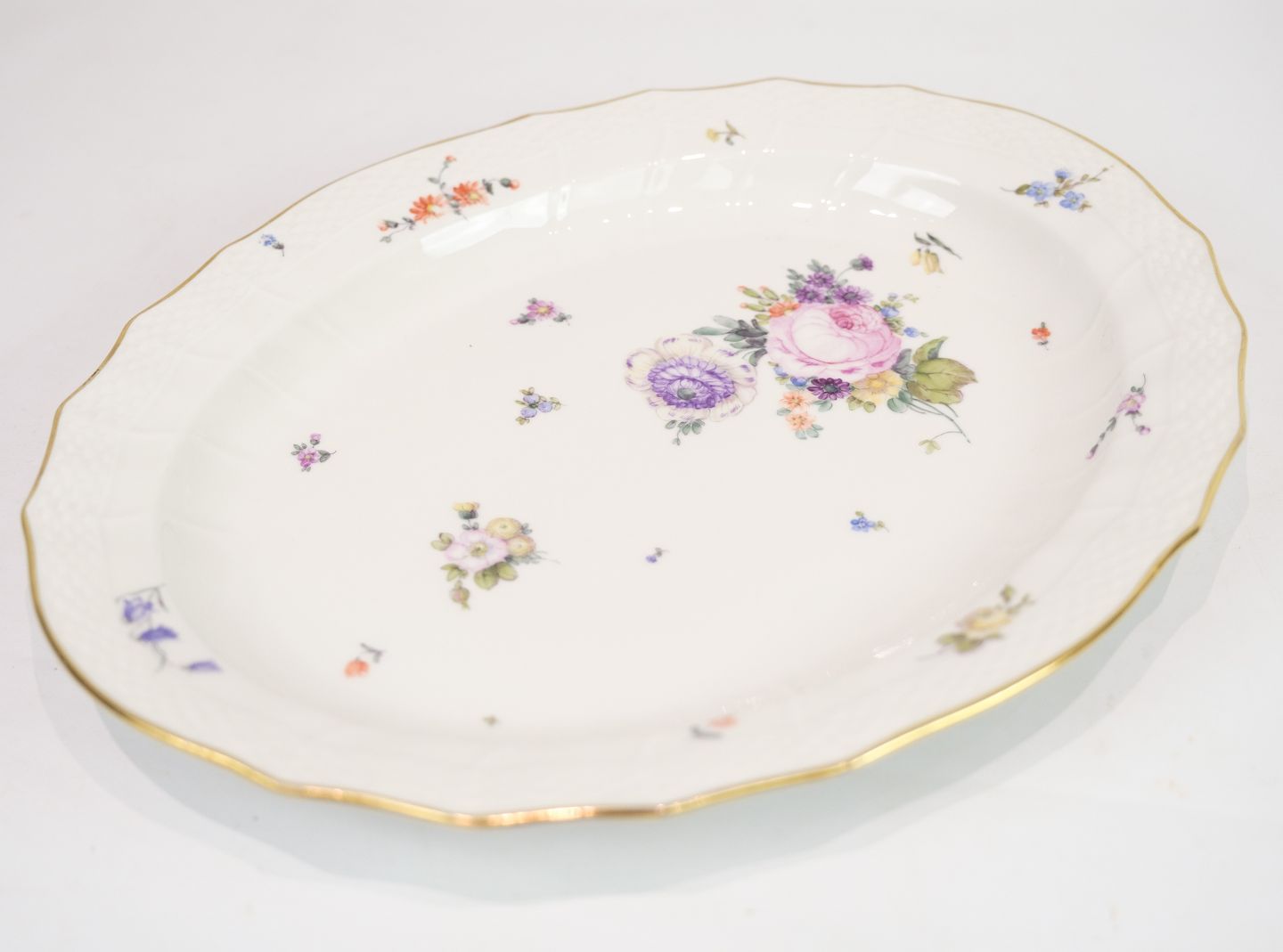 Dish of Royal porcelain with patterned Saxon flower decorated on the edge with gold. Manufactured by Royal Copenhagen in approx. 1923, where all their goods have been hand painted and subsequently become very rare. The dish is without flaws or defects.