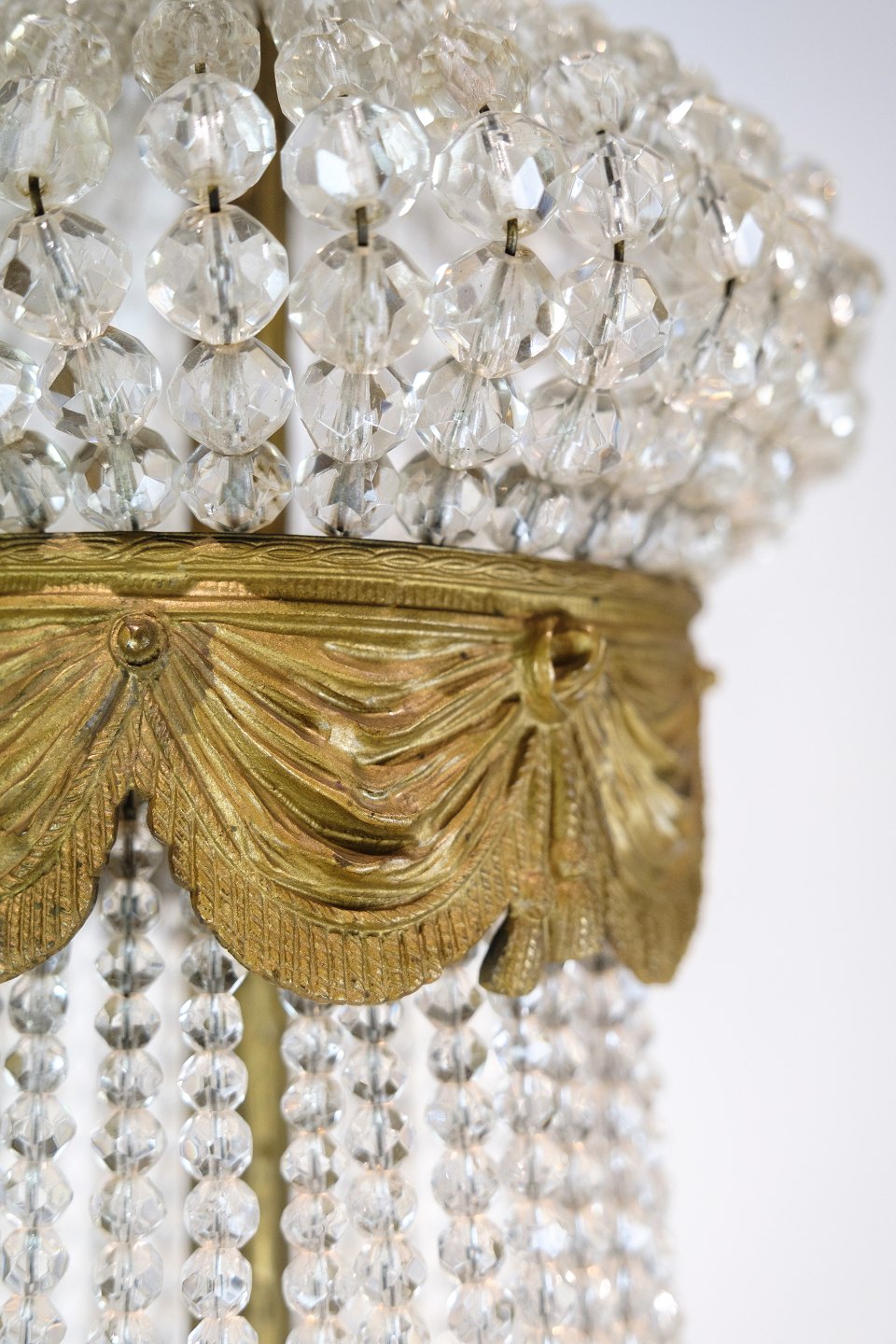 SoldAntique prism chandelier from the year 1890, made of brass and bronze, gilded and decorated with crystals. This chandelier is an example of the fine craftsmanship of the period, where precious metals and crystals create a luxurious and timeless atmosphere.