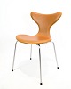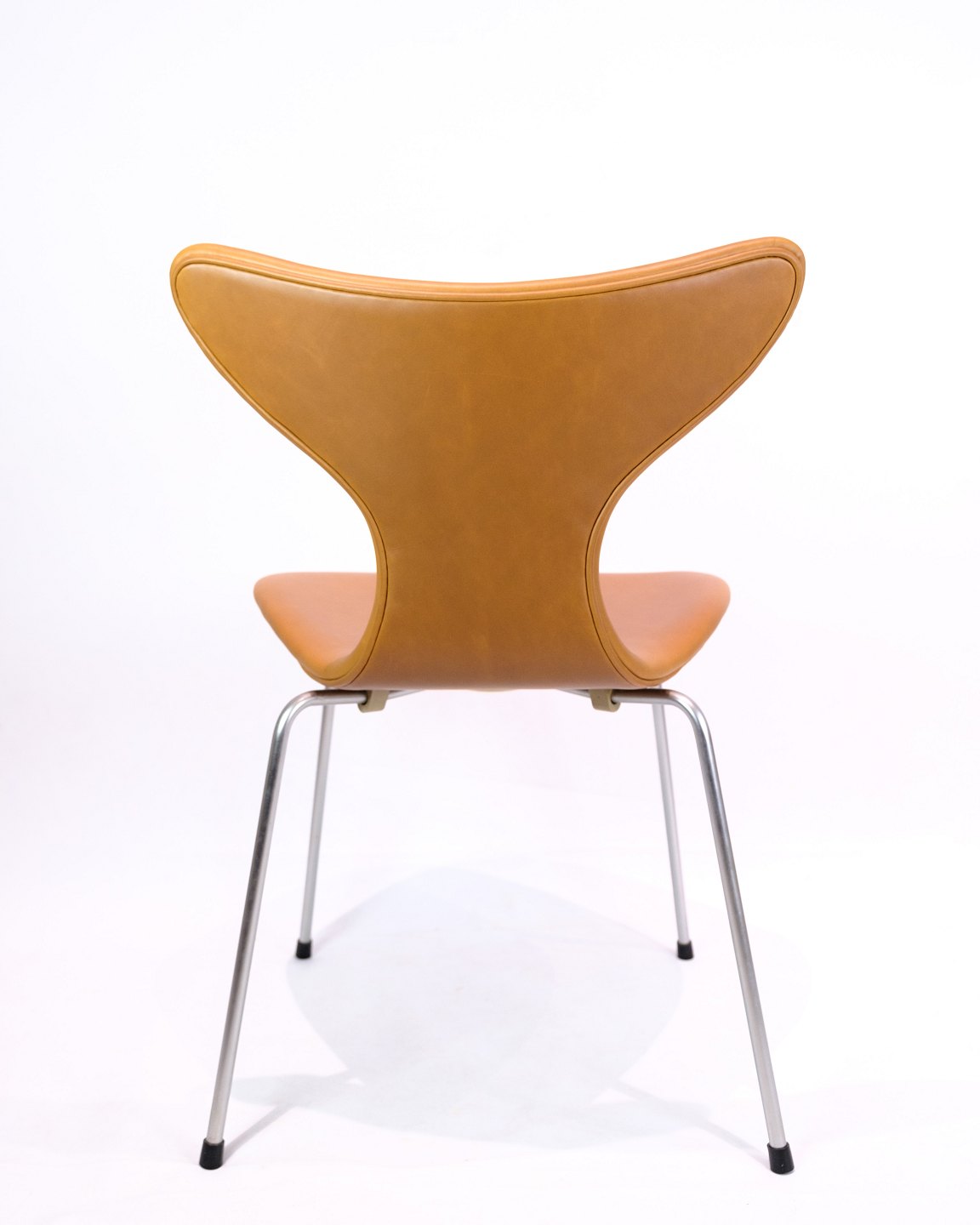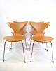 Sæt af 4 spisestuestole, model 3108 Lilje/Mågen, designet af Arne Jacobsen og produceret af Fritz Hansen i 1970'erne. Stolene er udført i et elegant design med blødt, formpresset træ, polstret i Cognac Elegance læder, der giver en kombination af komfort og holdbarhed.
