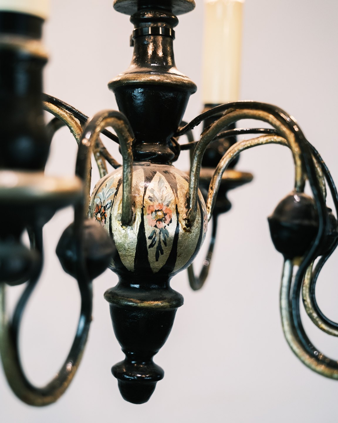 Church crown with 6 arms, made of wood and decorated with gold, from the 1930s. This chandelier combines classic craftsmanship with religious symbolism and period style, making it an impressive and historic piece.