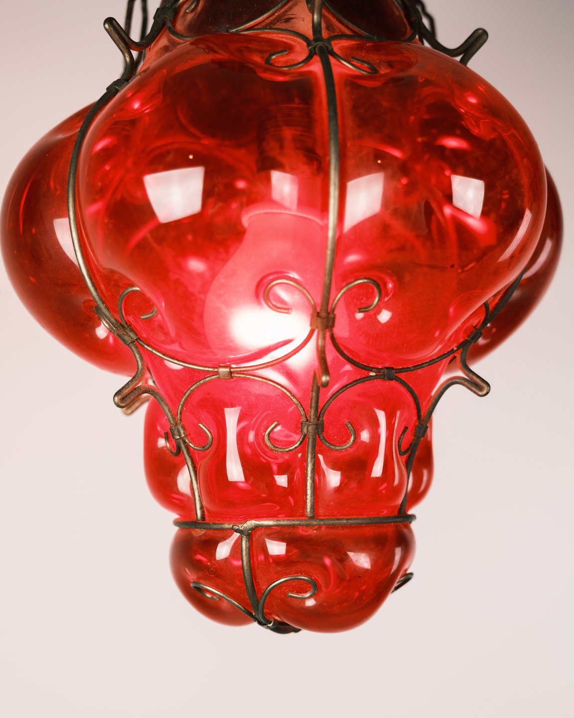 Lamp/Grid Pendant - Ruby Red Glass - Venetian Style - 1950s