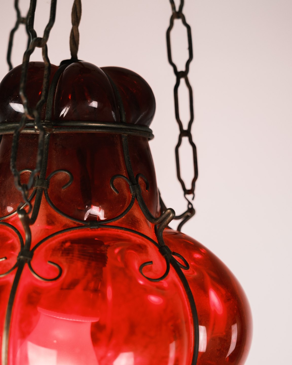Lamp/lattice pendant light from the 1950s in ruby ​​red glass. This unique vintage lamp brings both elegance and character to your home, and the deep red glass creates an atmospheric lighting effect.