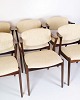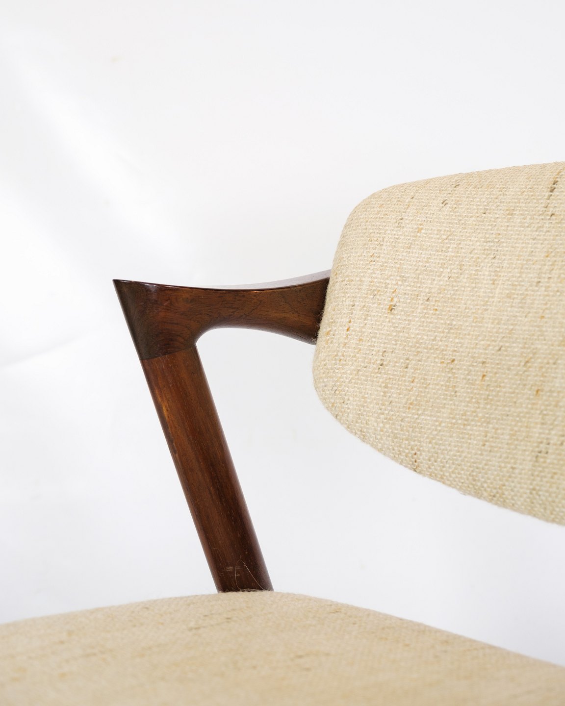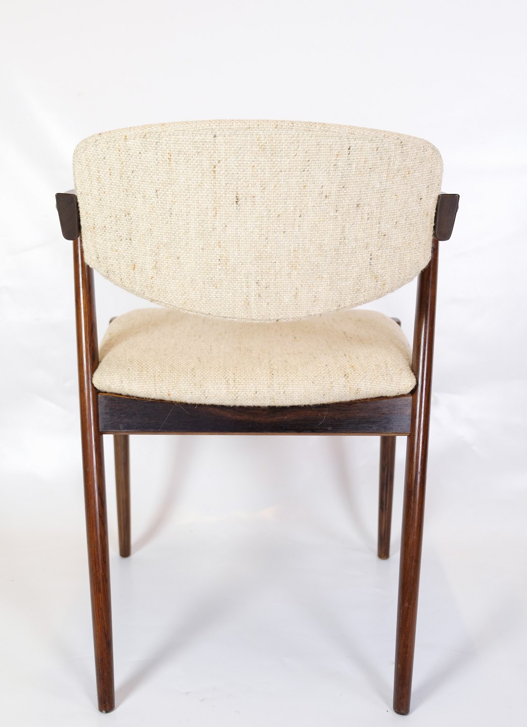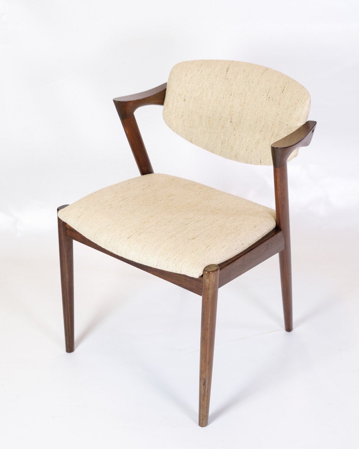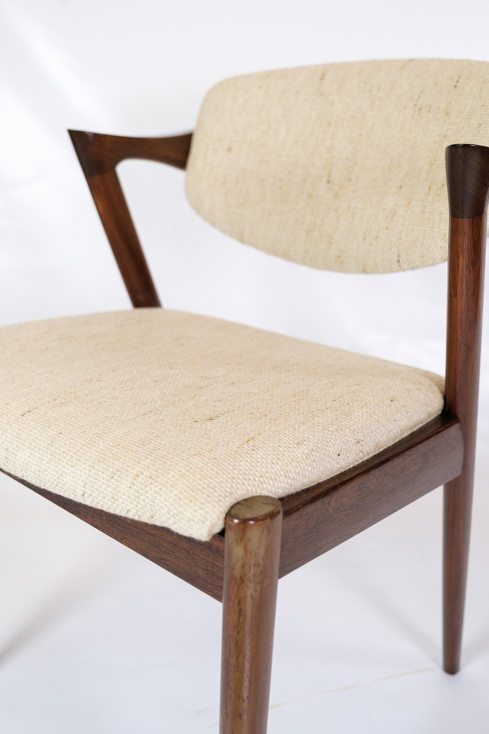 SoldSet of 6 dining table chairs, model 42, made of rosewood, designed by Kai Kristiansen and produced by Schou Andersen in the 1960s. The chairs have light fabric cushions that add comfort and a beautiful contrast to the dark tone of the rosewood. They are known for their slim, ergonomic design that combines comfort with an elegant aesthetic.