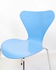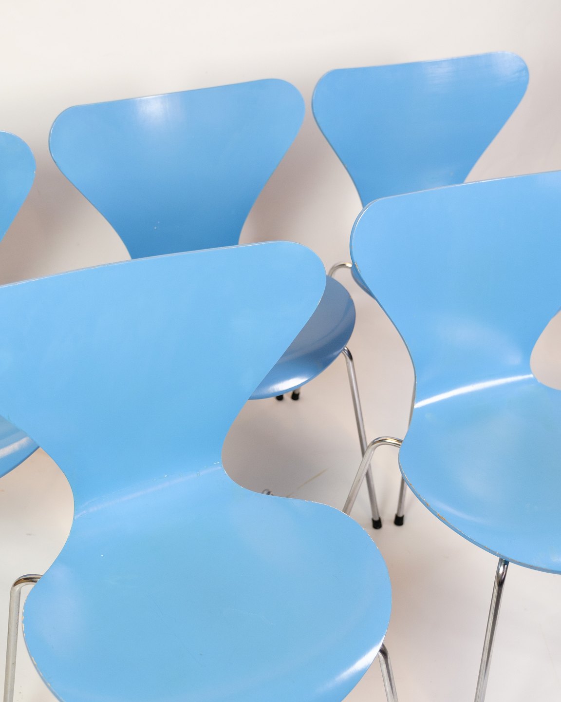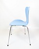Set of 5 dining chairs, model 3107, also known as the "Syver chair", designed by Arne Jacobsen and produced by Fritz Hansen in the 1980s. The chairs are lacquered in a light blue colour, which gives them an elegant and timeless look. The Seven chair is known for its comfortable and iconic shape, which combines functionality with a stylish design.