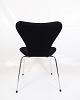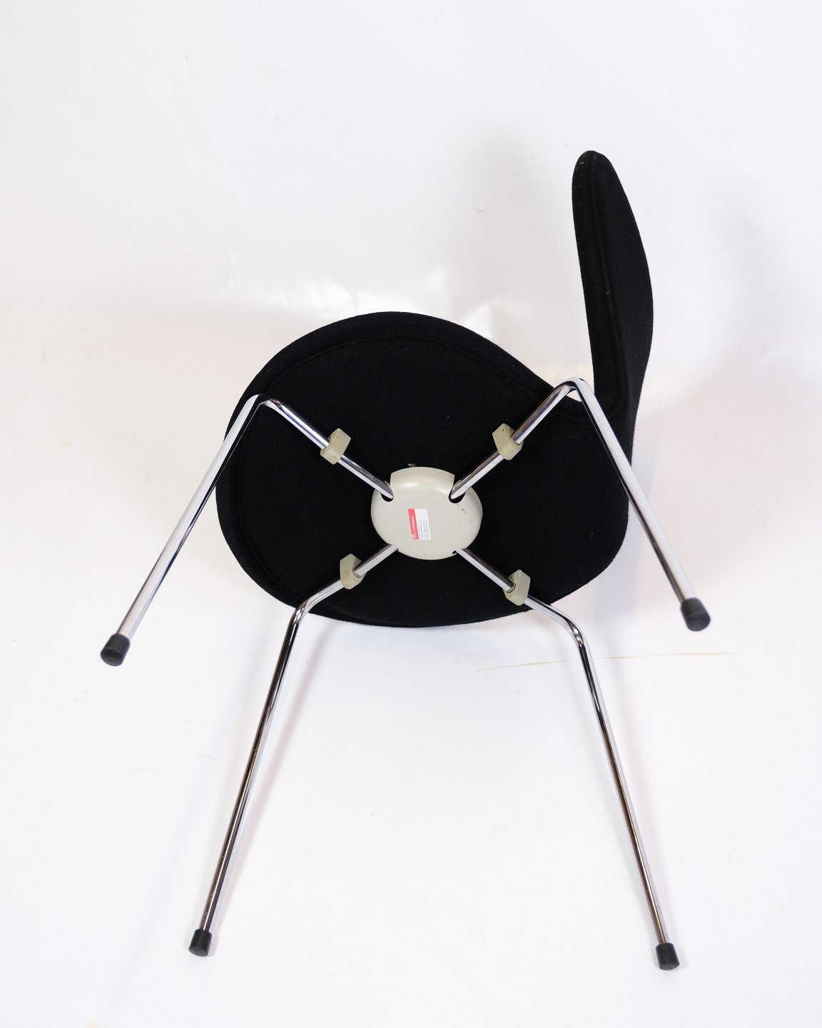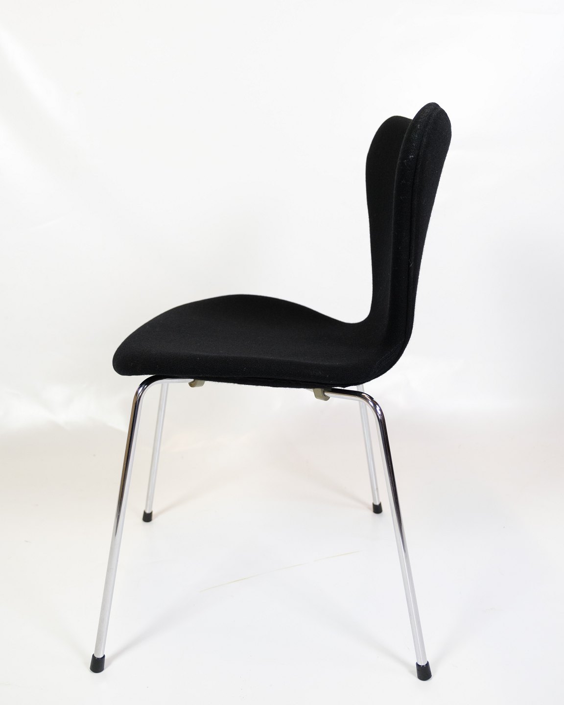 Set of 4 dining chairs, model 3107, also known as the "Seven Chair", designed by Arne Jacobsen and produced by Fritz Hansen. The chairs are originally upholstered in black fabric. The Syver chair is known for its comfortable and iconic shape, which combines functionality with a stylish design.