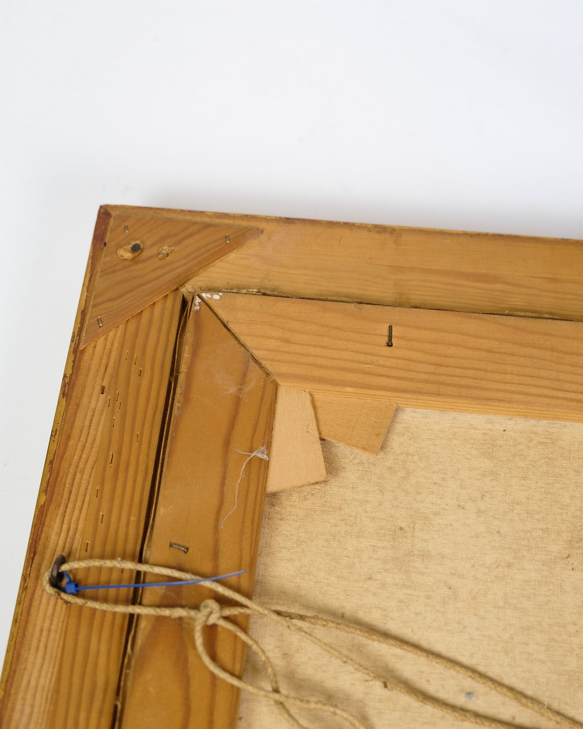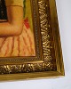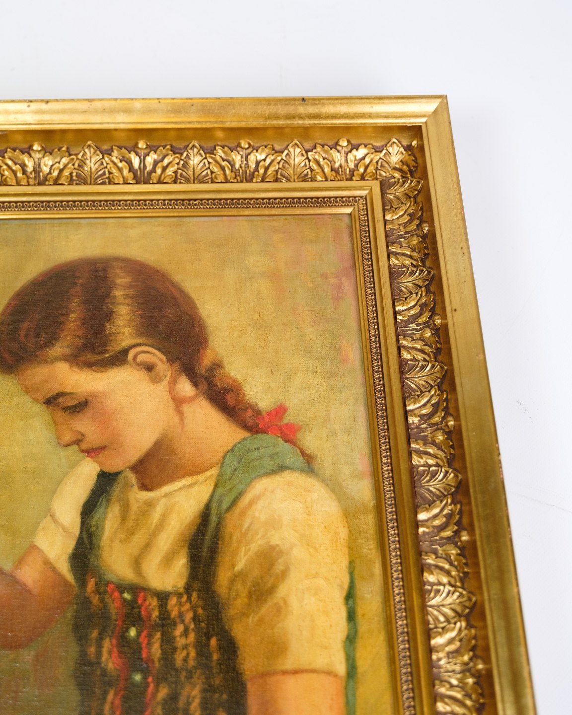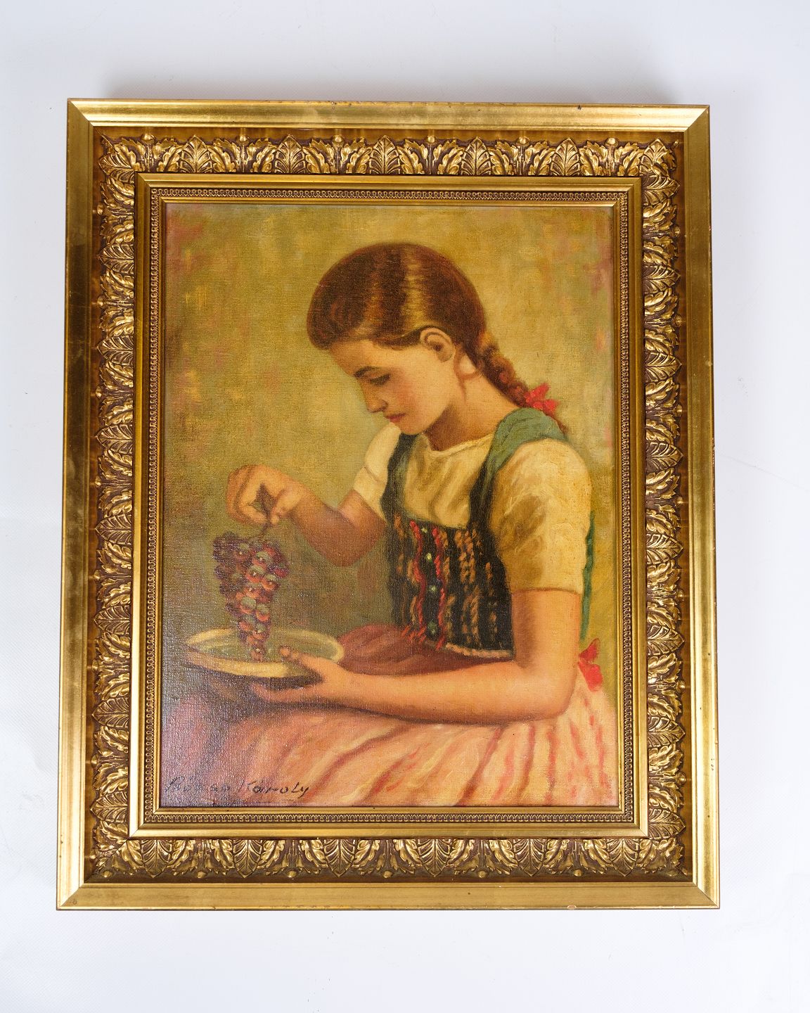 Oil painting framed in a gilded wooden frame with a motif of a little girl holding a bunch of grapes. Painted in warm colors. Signed.