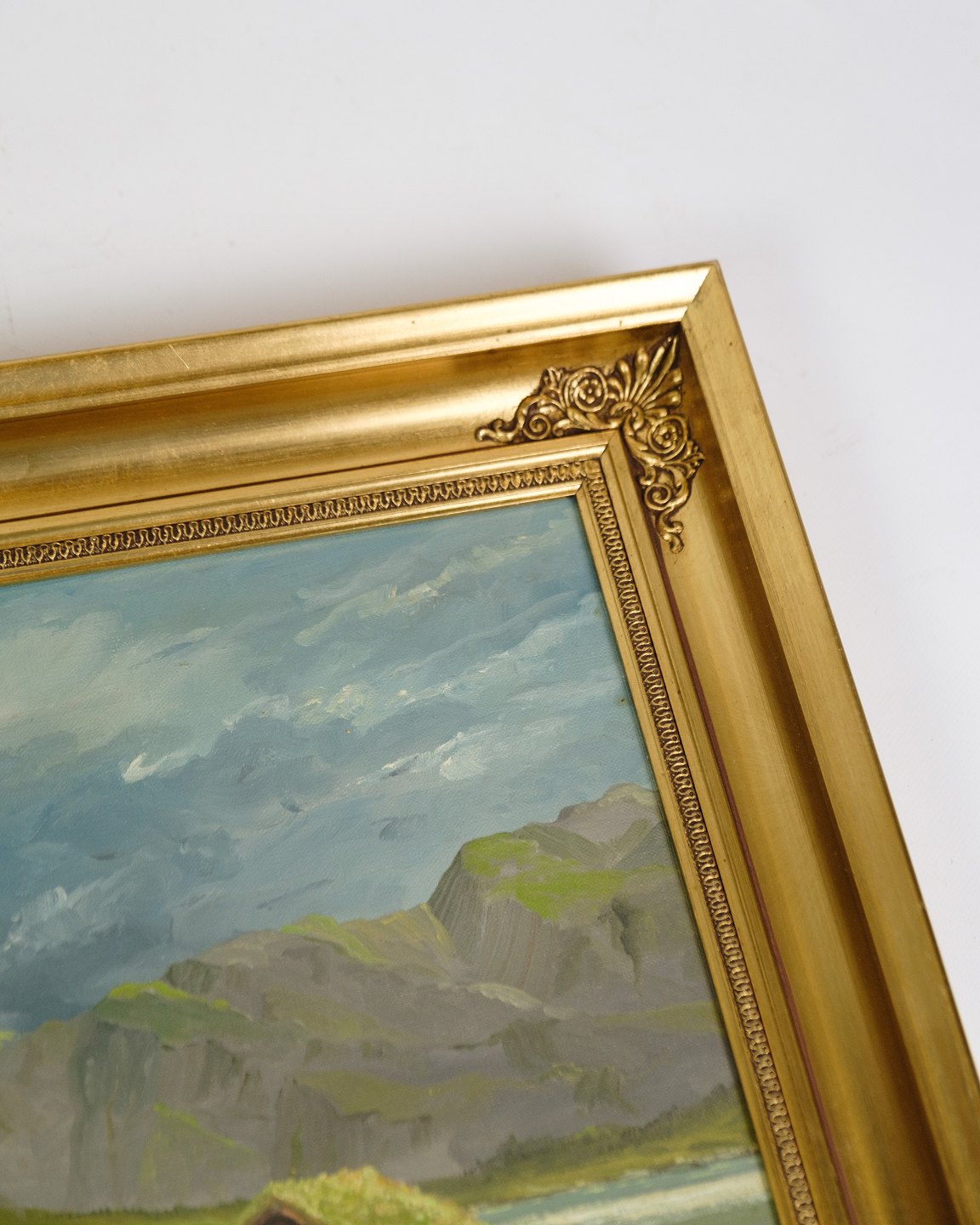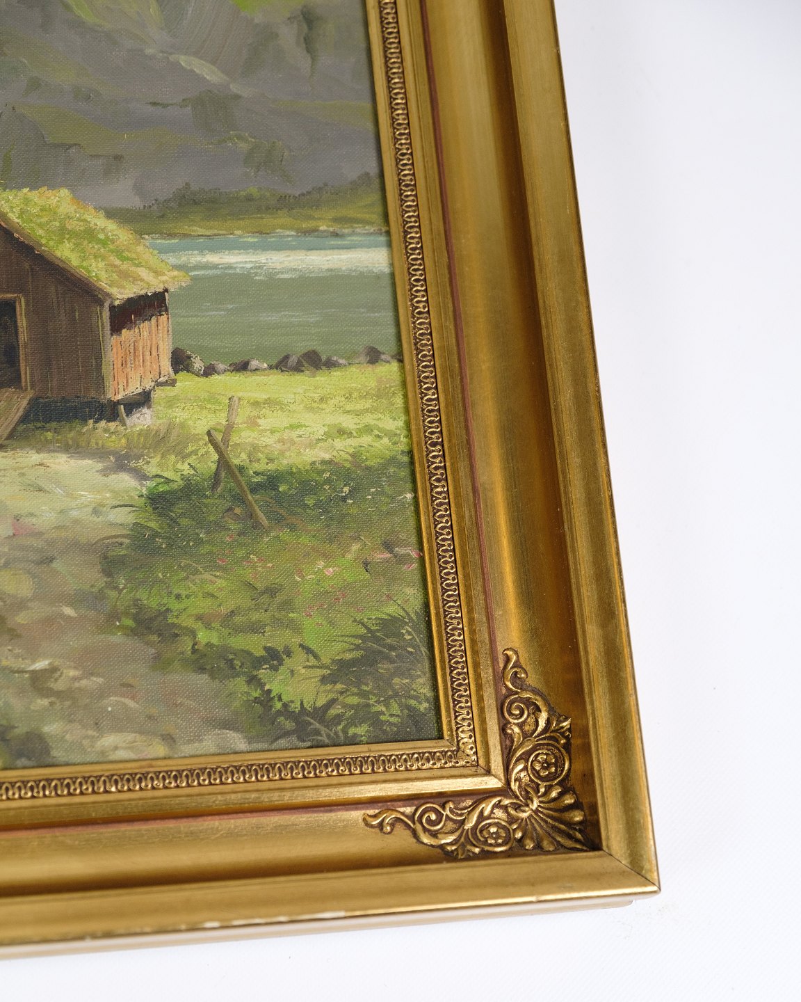 Oil painting framed in a gilded wooden frame with the motif of a cabin out in a mountain landscape. Signed by P. Svarter from the 1970s