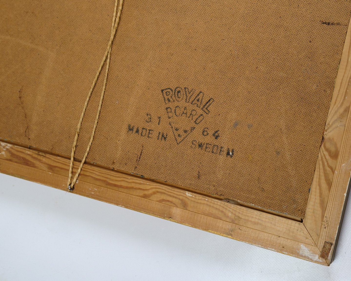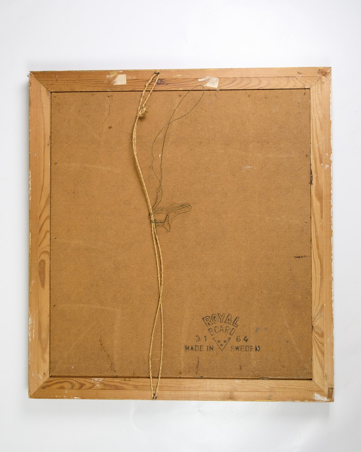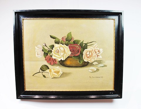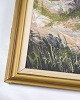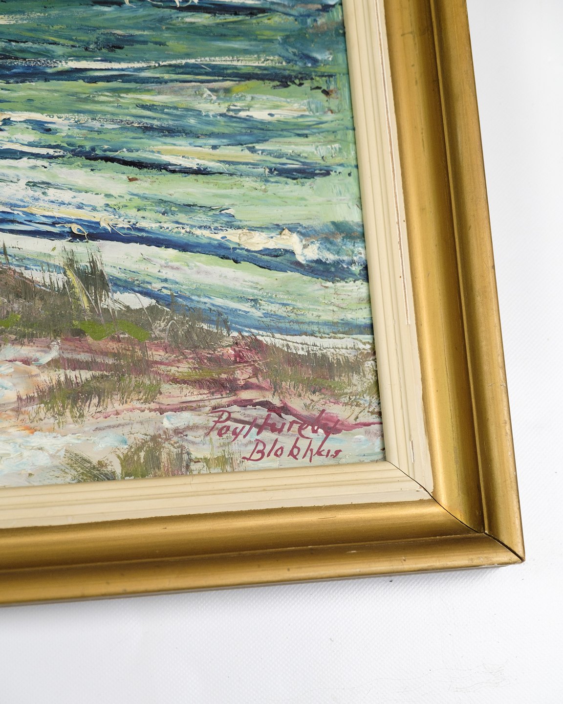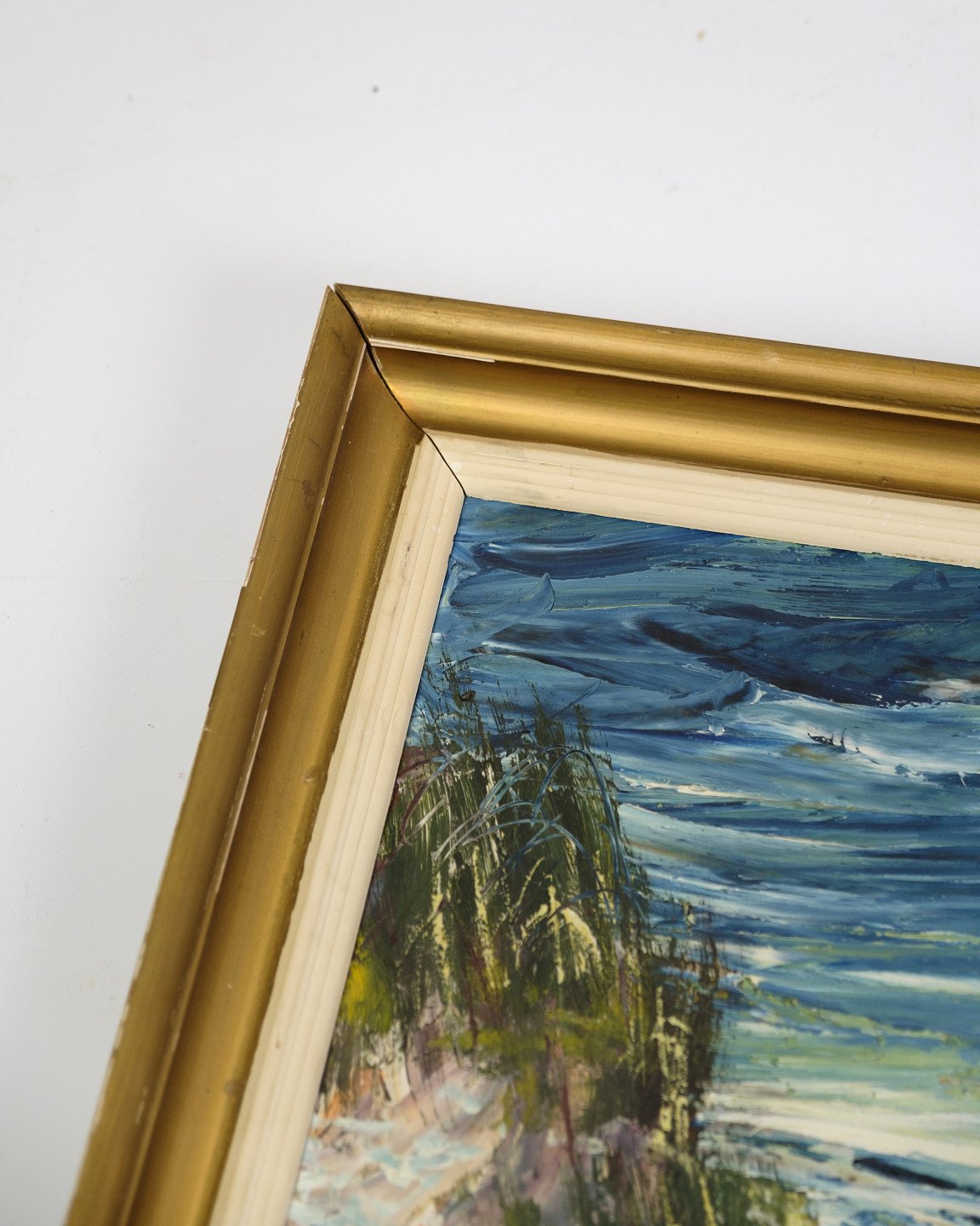 Oliemaleri med motiv af kysten, sandklitterne og havet i baggrunden i blæsevejr med en mørkeblå himmel. I en forgyldt ramme og signeret af Poul Fureby.