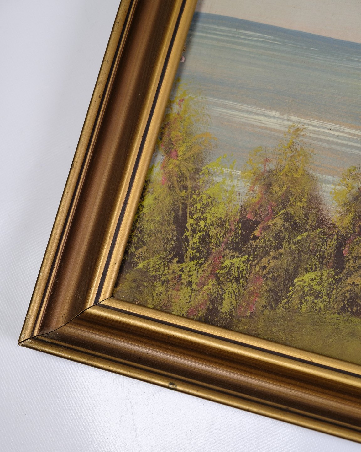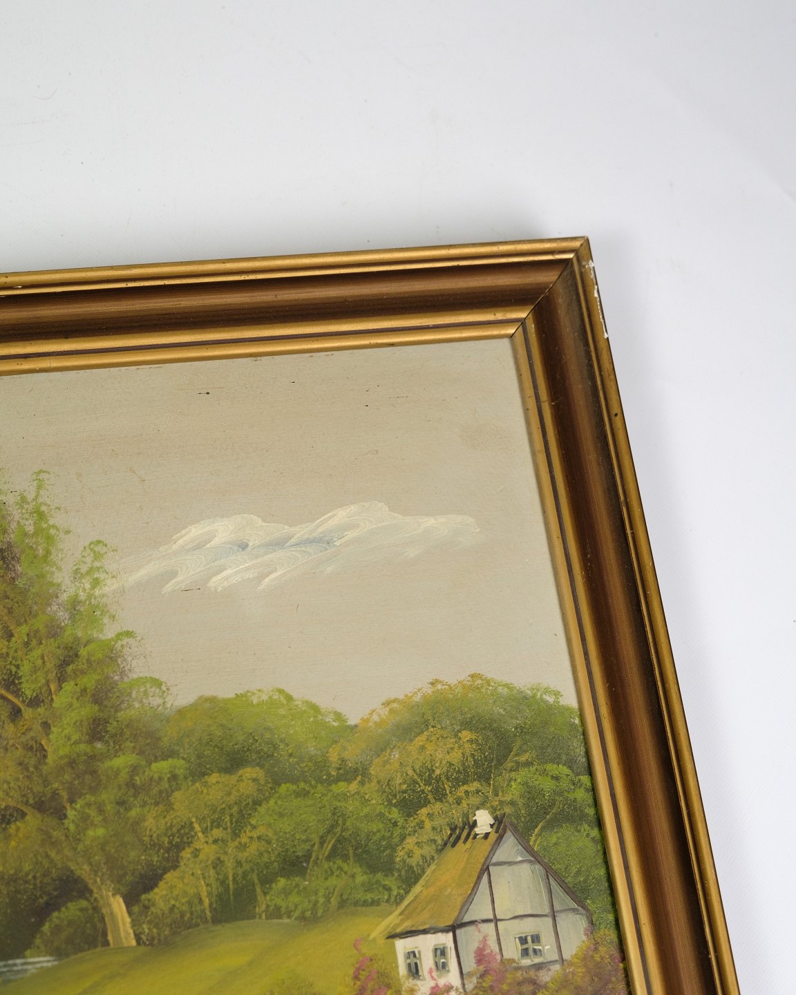 Painting on canvas with the motif of a farmhouse located in a forest, with the forest and the water as a background to the picture. A small road leads down to the house and creates an atmospheric connection between nature and home. The painting captures a peaceful atmosphere with the calm elements of nature.