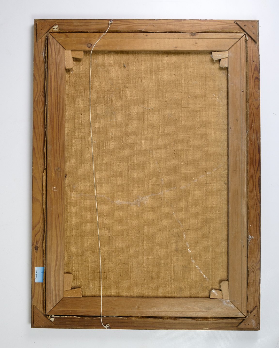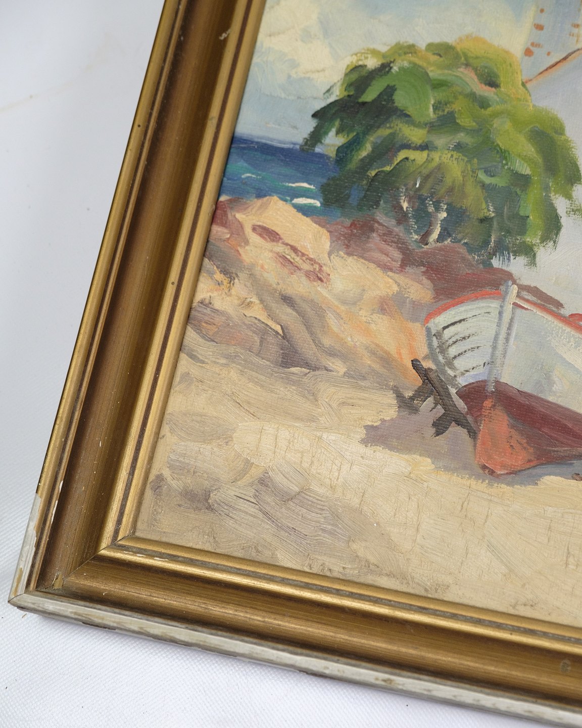 Oliemaleri med motiv af en fiskerkone, der hænger ting til tørre. I baggrunden ses et lille hus med et skur ved siden af, og kysten kan skimtes bagved huset. I forgrunden står en båd, der tilfører billedet en autentisk kyststemning.