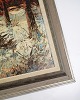 Oliemaleri med motiv af en snedækket granskov og en solnedgang i baggrunden, der skaber et stemningsfuldt lys over landskabet. Maleriet er indrammet i en solid træramme, som fremhæver motivets naturlige skønhed.