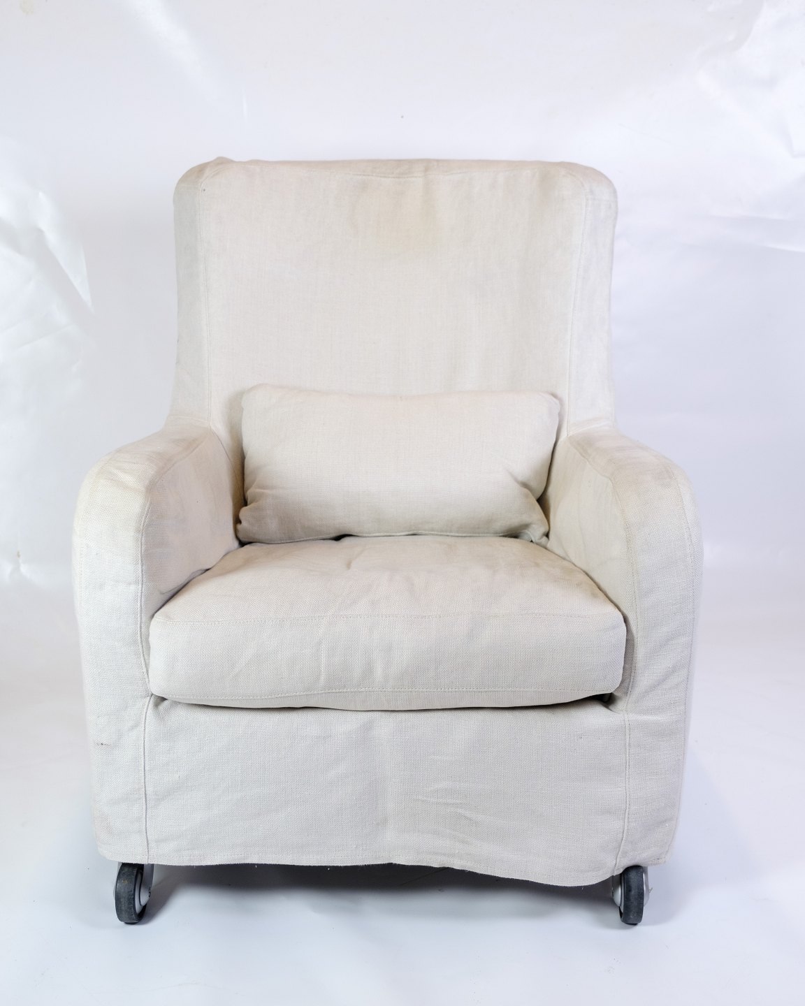 Designed by Marac, a recognized name in Italian furniture design, this armchair shows a perfect balance between form and function. With two legs at the back and two wheels at the front, the chair adds a unique touch of lightness and mobility to its appearance.