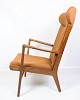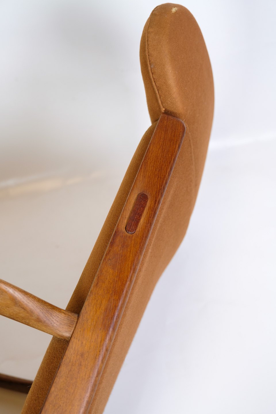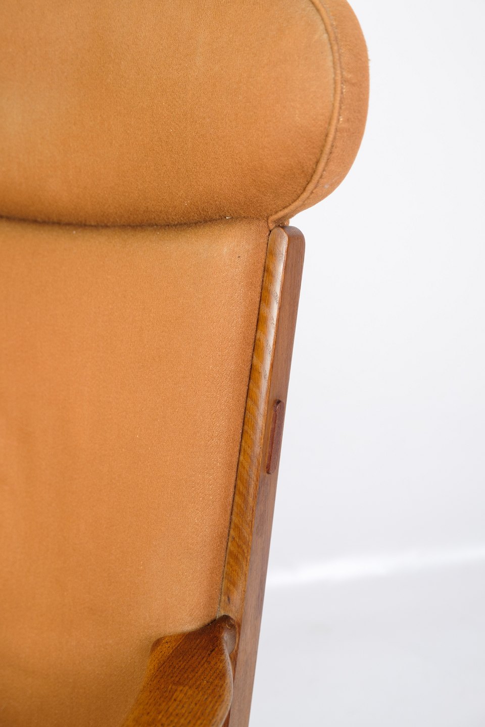 Kontakt os vedrørende prisLænestolen model AP 15, designet af Hans J. Wegner og produceret af AP Stolen i 1951, er udført i egetræ og polstret med orange stof. Stolen er kendt for sin høje ryg og buede armlæn, der giver både komfort og et elegant udtryk.