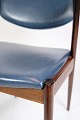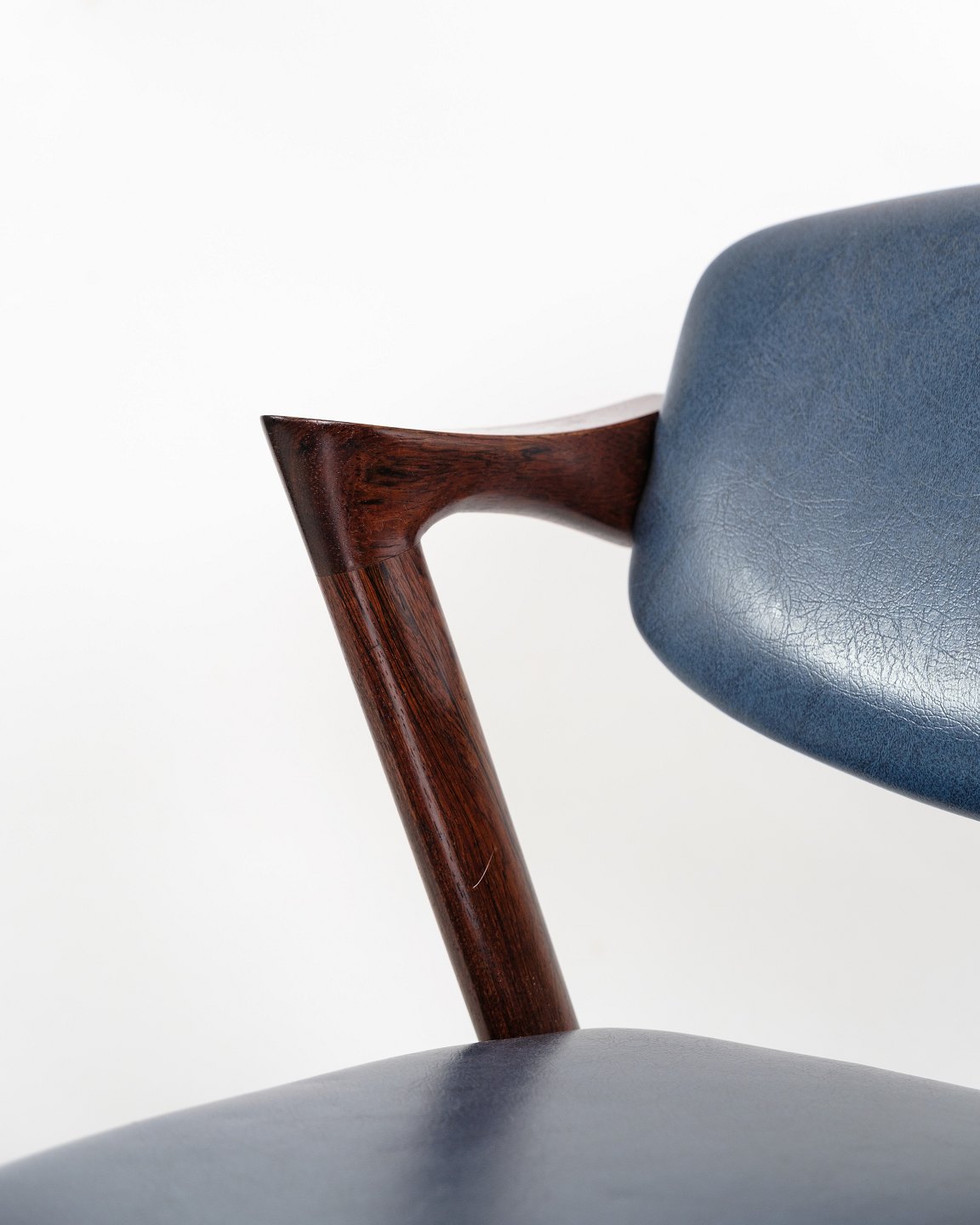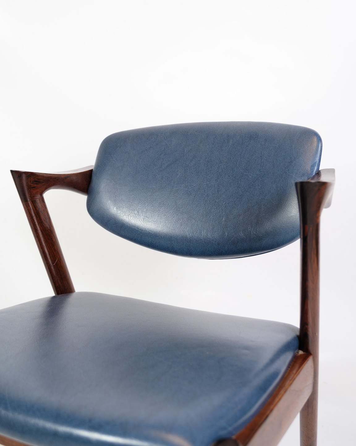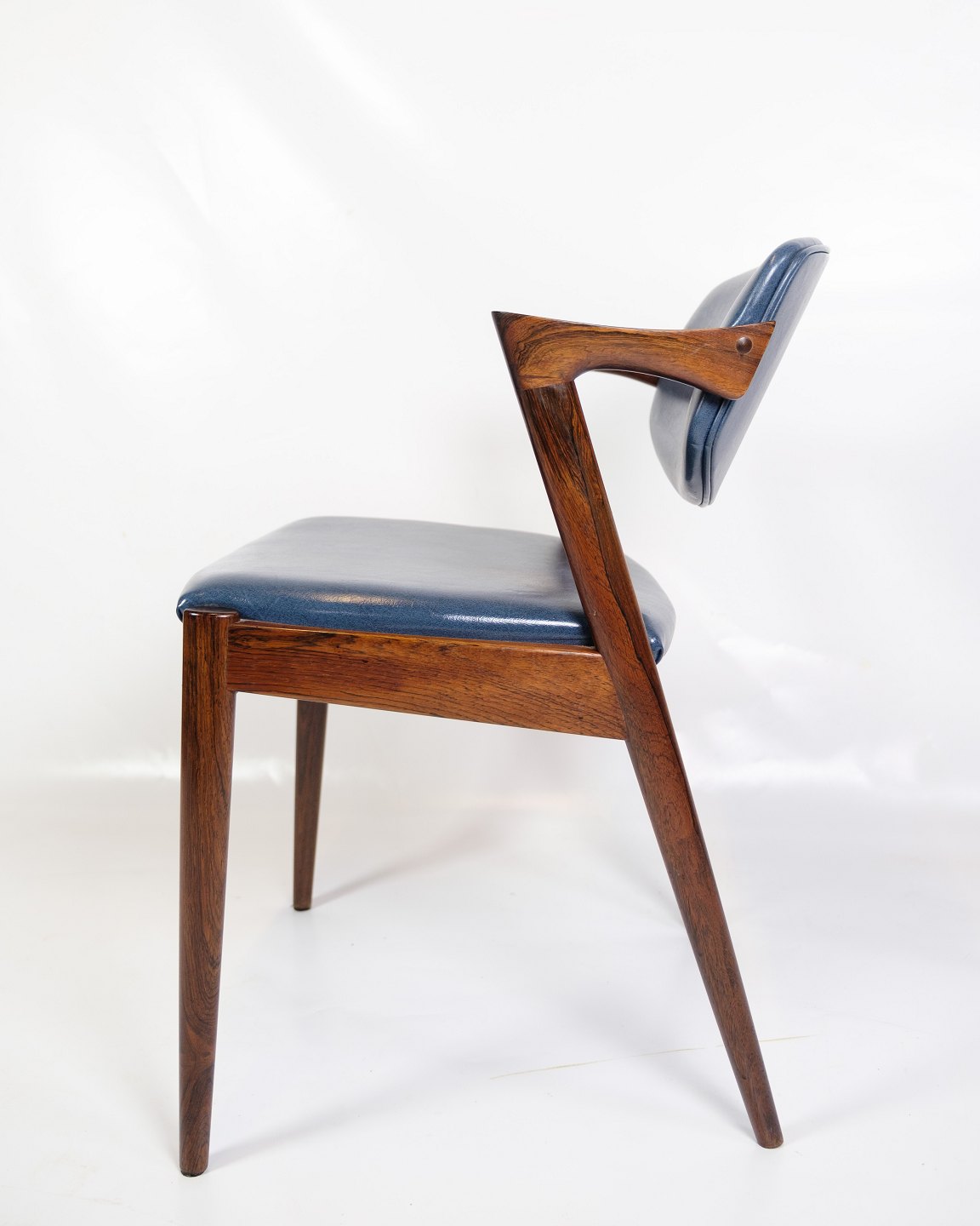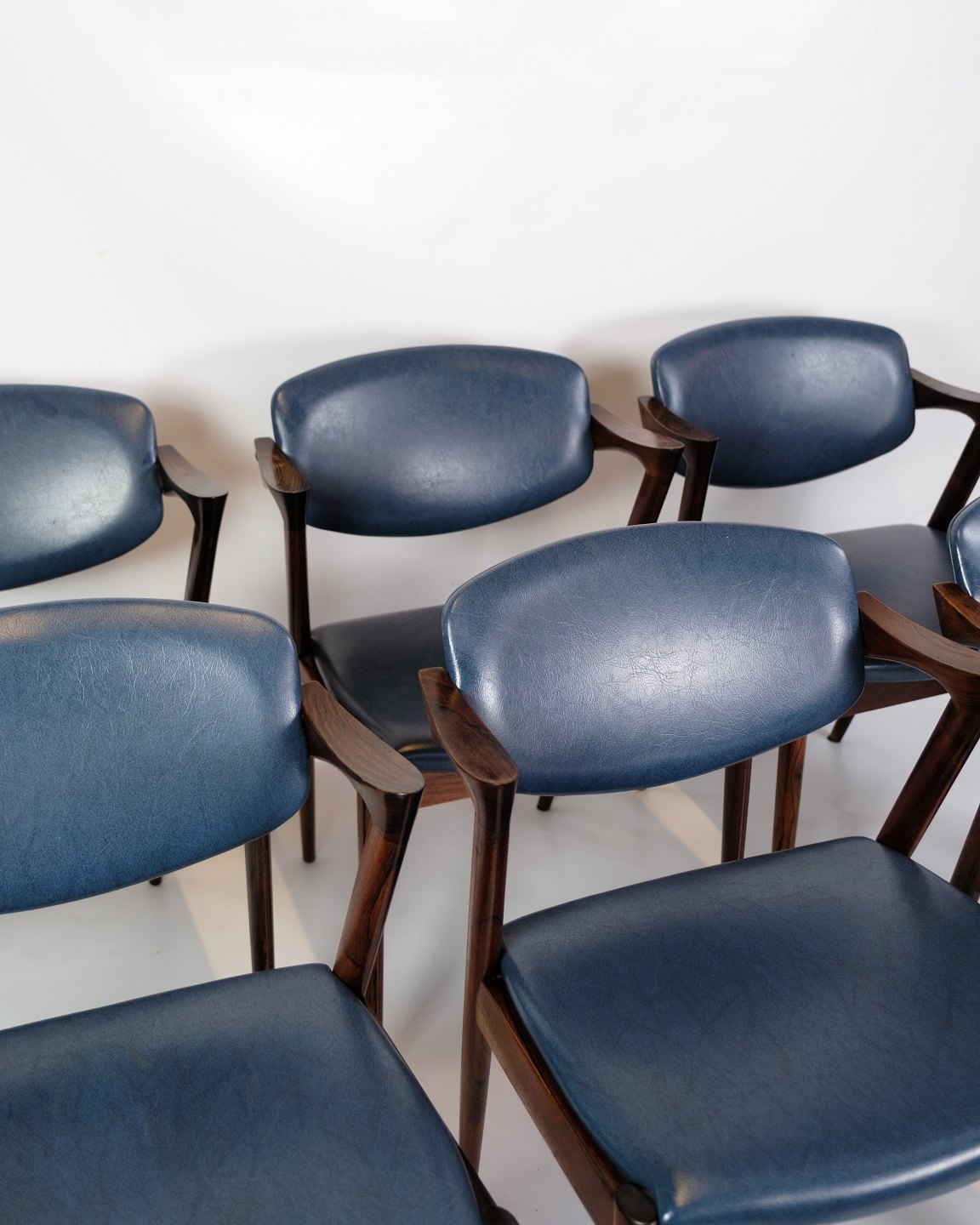 Set of 6 dining table chairs in rosewood with blue leather upholstery, designed by Kai Kristiansen. The chairs have a frame in rosewood, which shows the beautiful grain patterns in the wood, and they are upholstered with blue leather, which is both comfortable and durable.