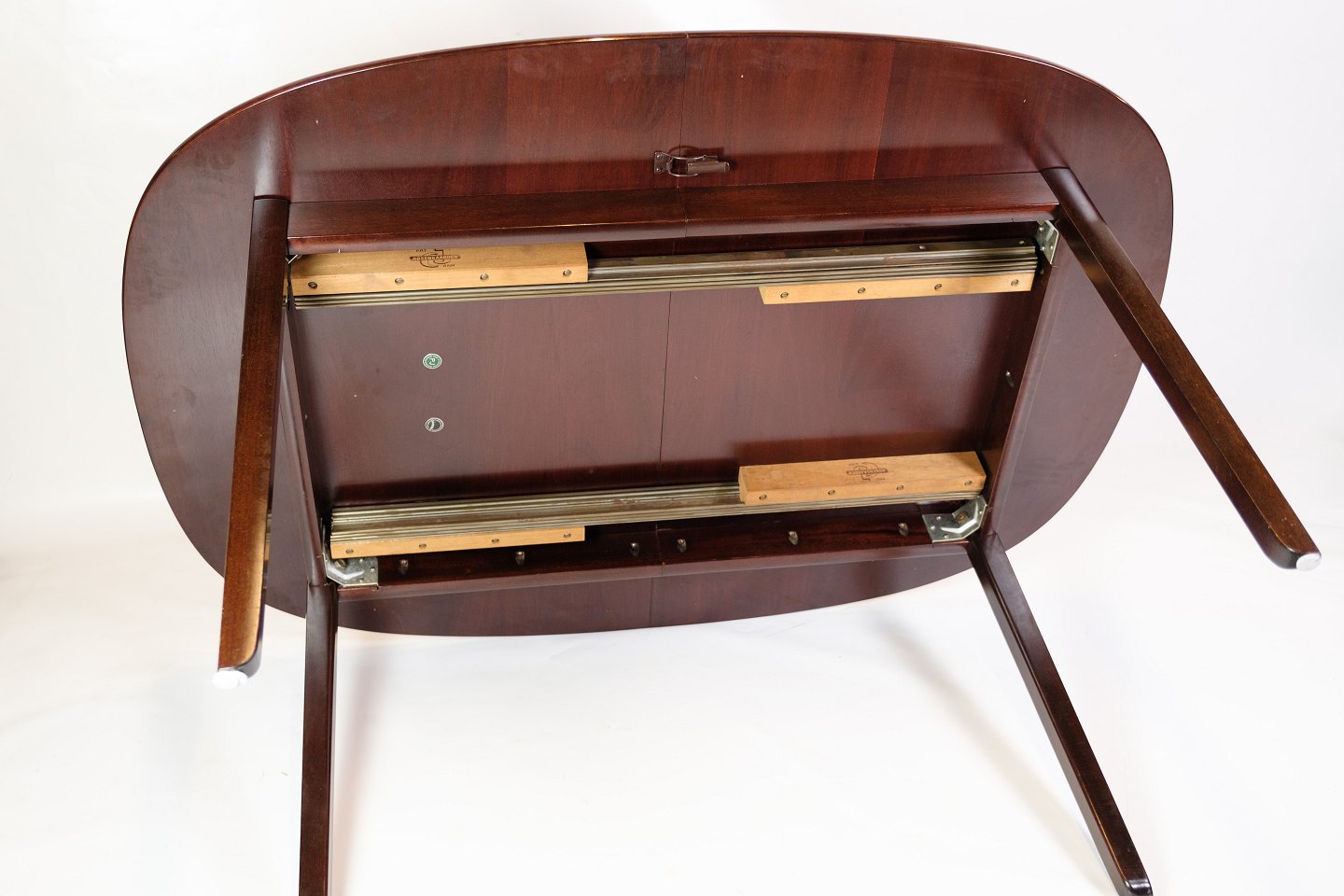 Dining table in mahogany, designed by Ole Wanscher and produced by P. Jeppesen in the 1960s. The table is made of solid mahogany, which gives it an elegant and classic appearance. Ole Wanscher was known for his refined design and his focus on quality craftsmanship.