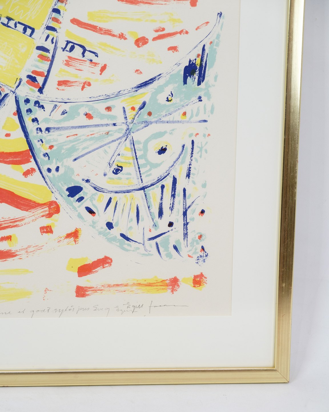 Dette litografi er skabt af Egil Jacobsen, en anerkendt dansk kunstner, der er kendt for sine farverige og ekspressive værker. Motivet er karakteristisk for hans stil med levende farver og abstrakte former, som balancerer mellem spontanitet og kontrol. Litografiet er indrammet i en elegant guldramme, der fremhæver værkets udtryk. Dette kunstværk er et smukt eksempel på moderne dansk kunst og passer godt ind i både klassiske og moderne indretninger.