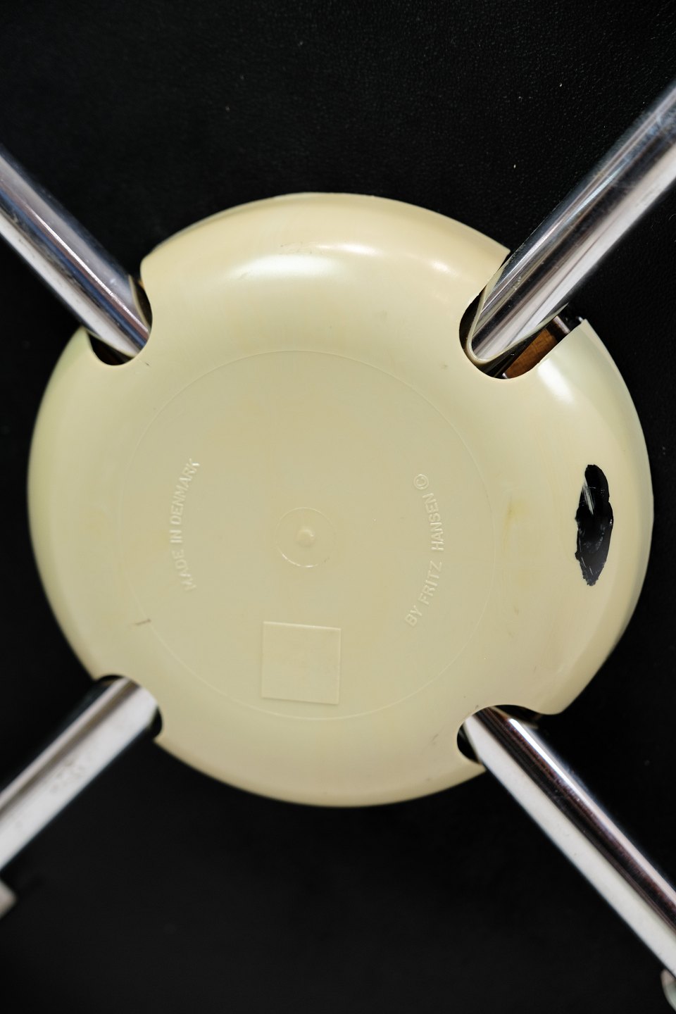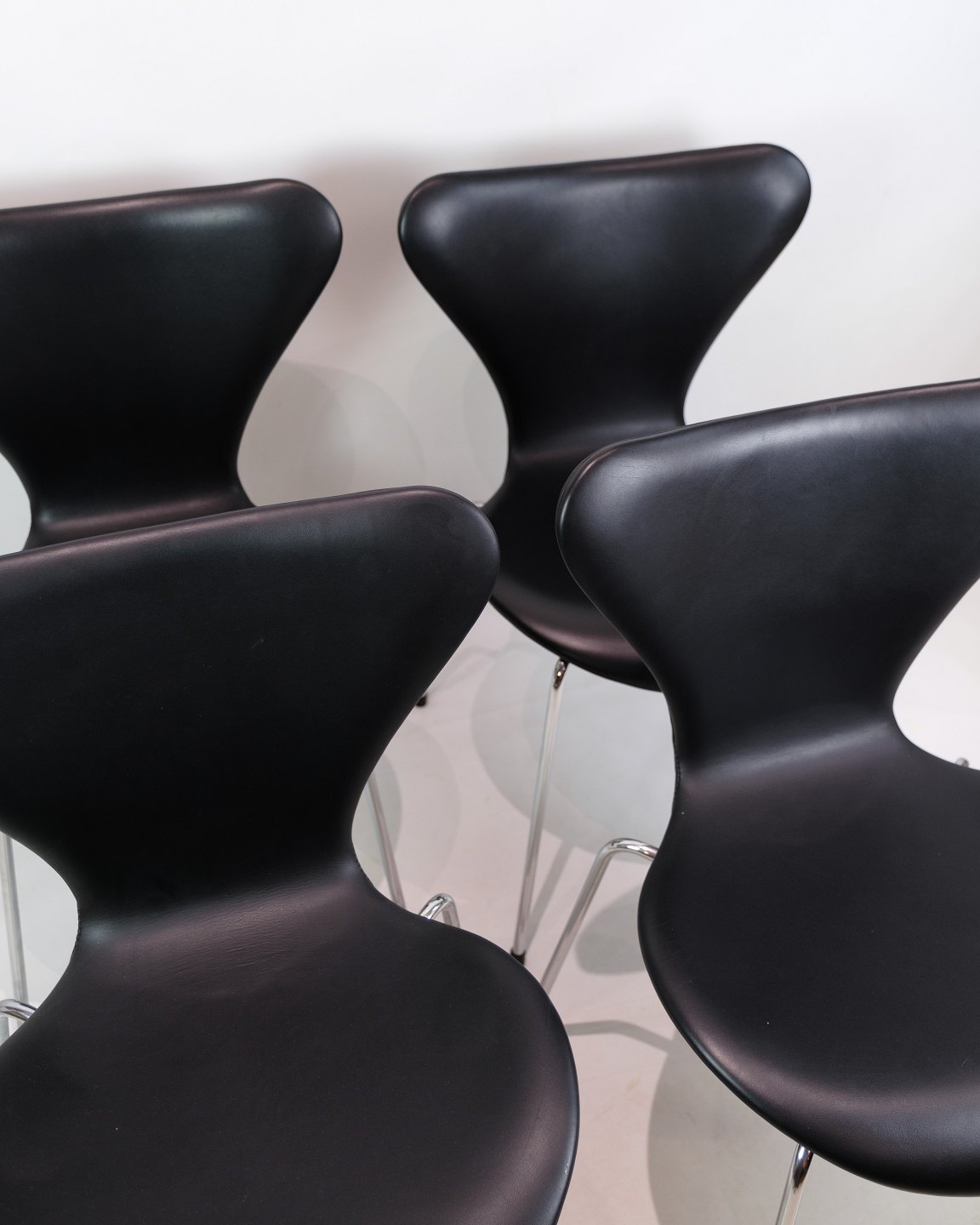 Sæt af fire syverstole med sjælden årgang med en gammel fabriks syning, som man kun ser på de ældre produceret syverstole. Designet af Arne Jacobsen og produceret af Fritz Hansen. Står med fine blanke stel uden nogen form for rust.