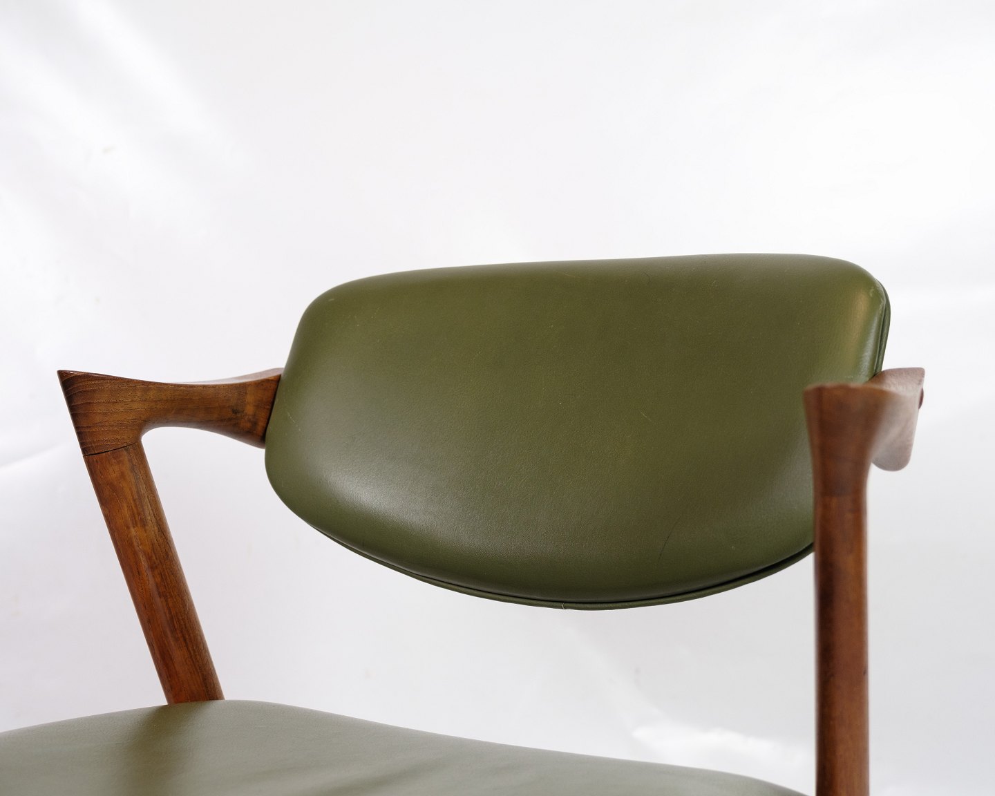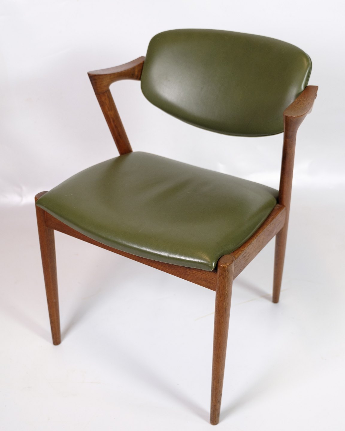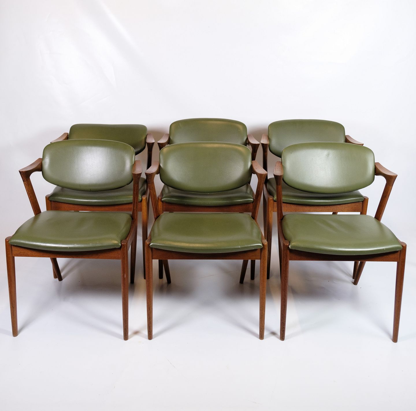 Sæt af 6 spisestuestole, model 42, designet af Kai Kristiansen og produceret af Schou Andersen i 1960'erne. Stolene er udført i teak, hvilket giver dem et varmt og naturligt udtryk, og de er polstret med grønt læder. Model 42 er kendt for sin ergonomiske udformning med skråtstillede ryglæn, som giver en behagelig siddeoplevelse og god støtte.