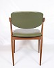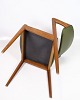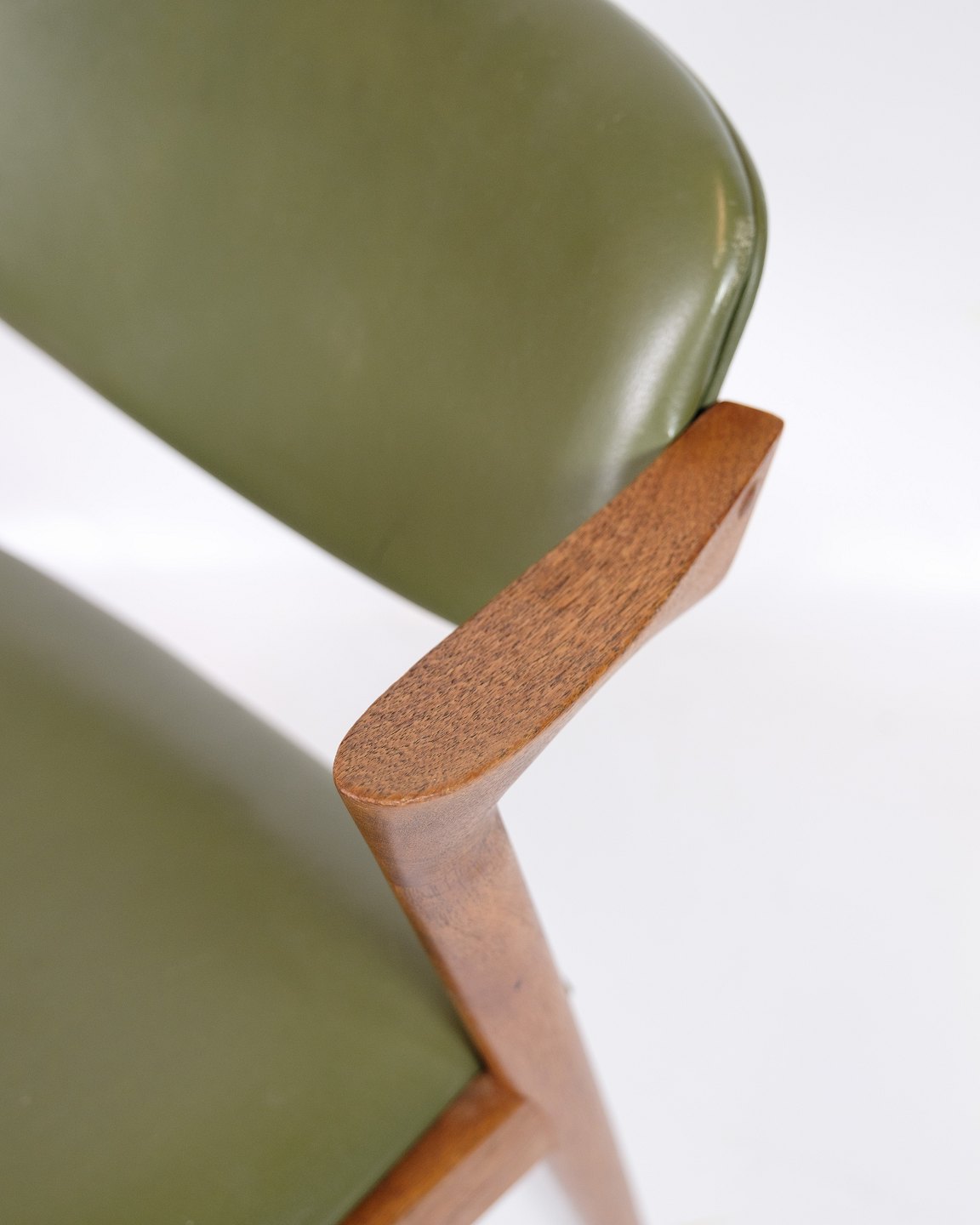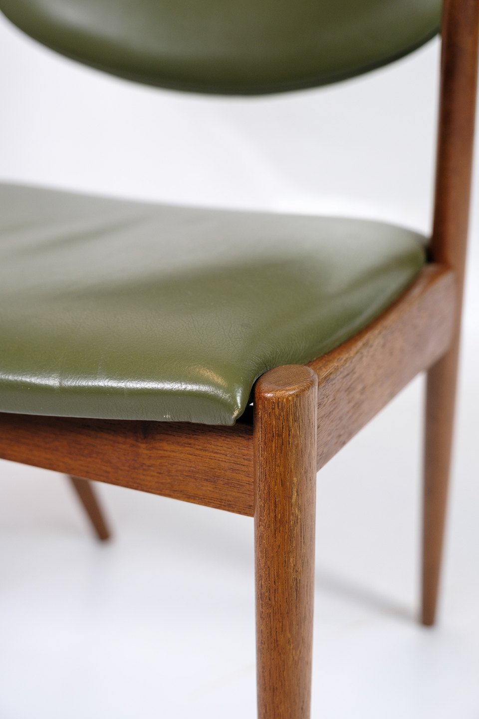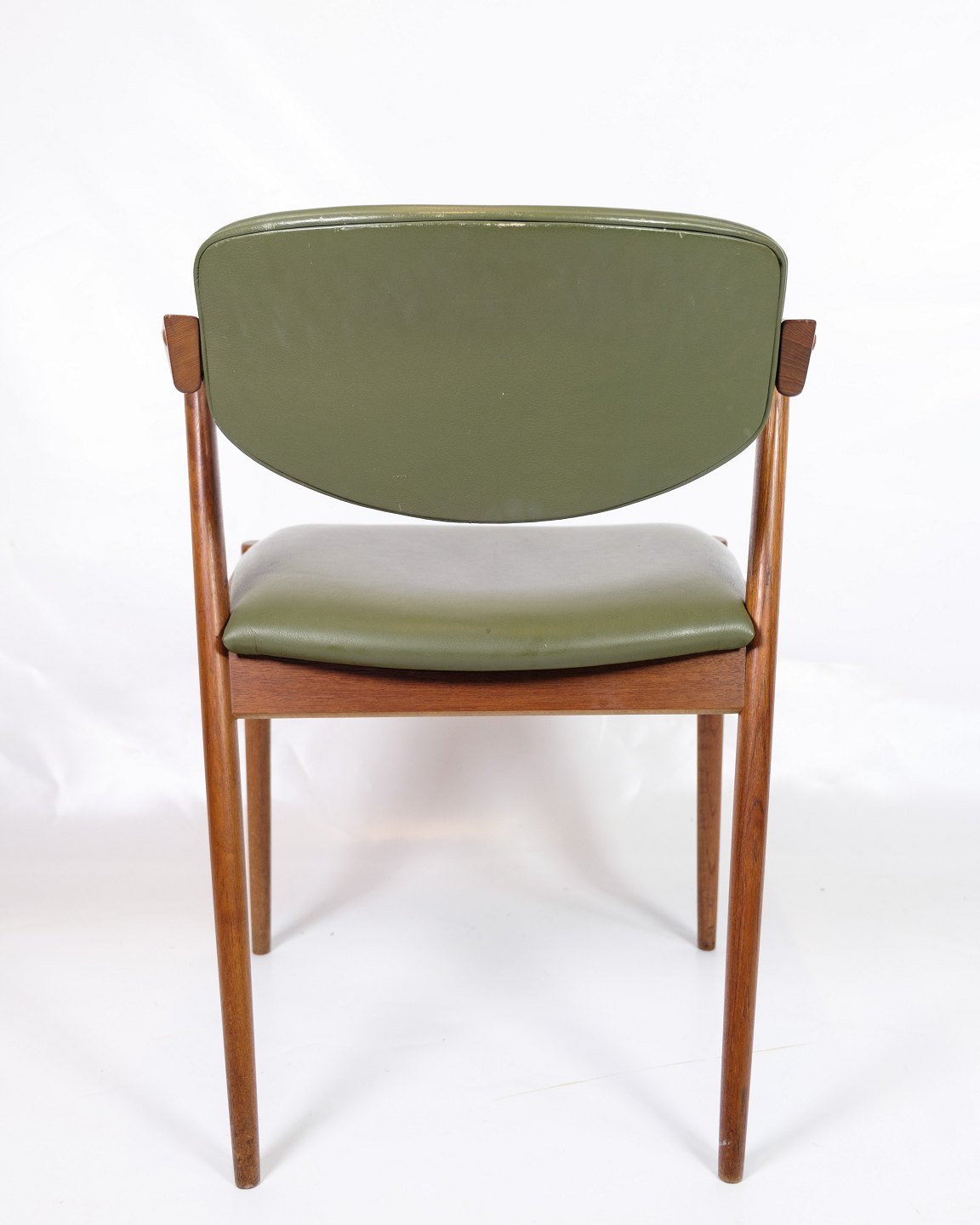 Sæt af 6 spisestuestole, model 42, designet af Kai Kristiansen og produceret af Schou Andersen i 1960'erne. Stolene er udført i teak, hvilket giver dem et varmt og naturligt udtryk, og de er polstret med grønt læder. Model 42 er kendt for sin ergonomiske udformning med skråtstillede ryglæn, som giver en behagelig siddeoplevelse og god støtte.