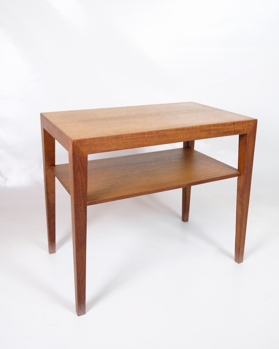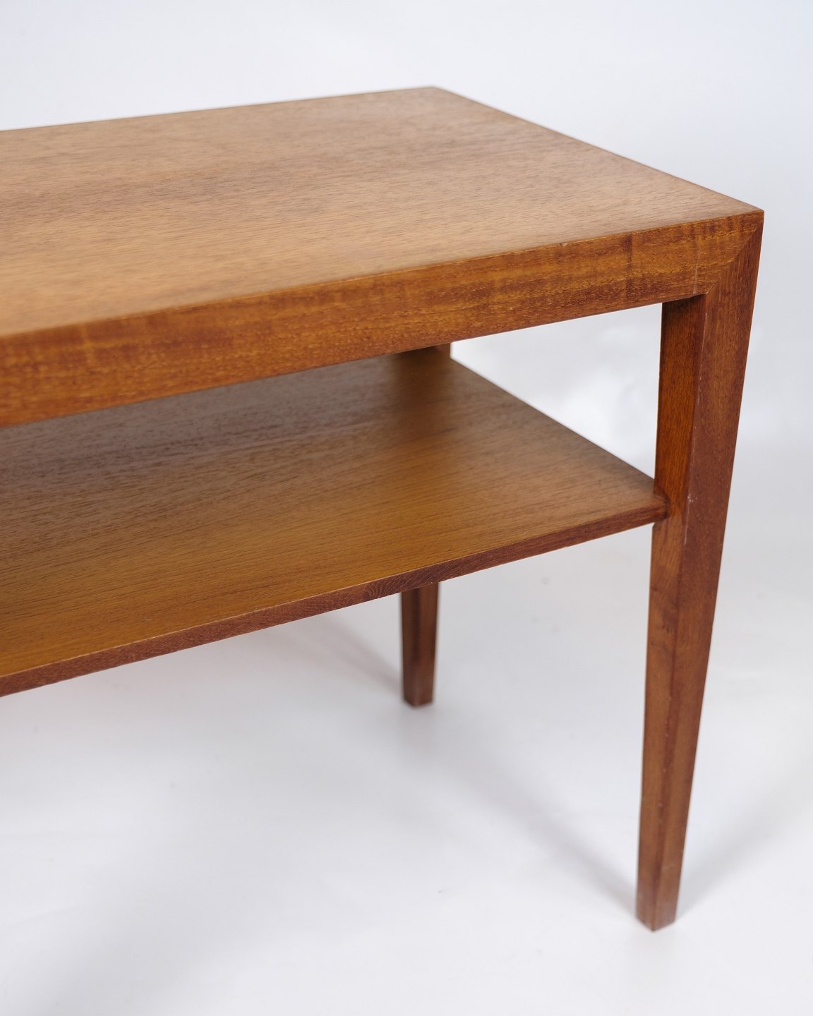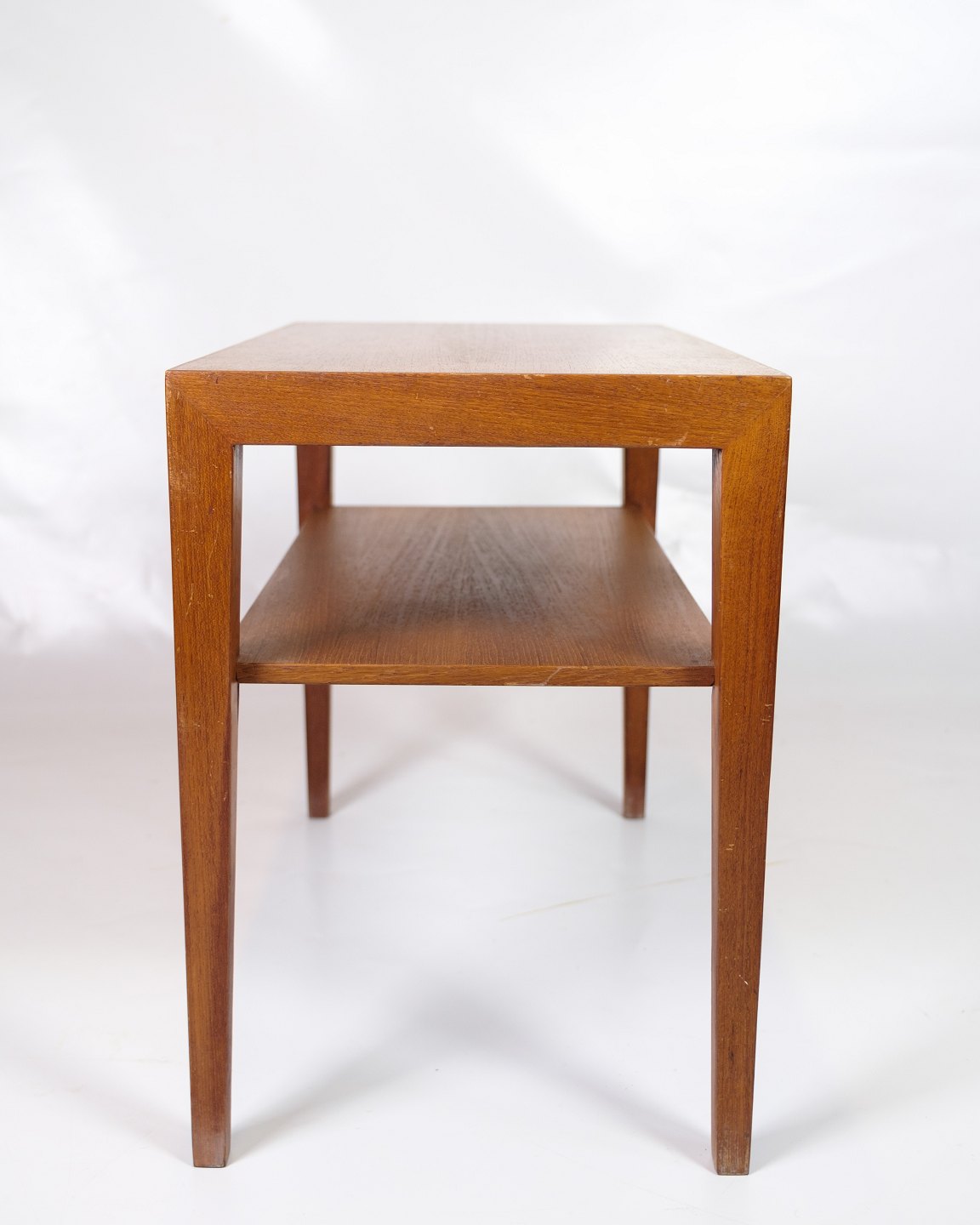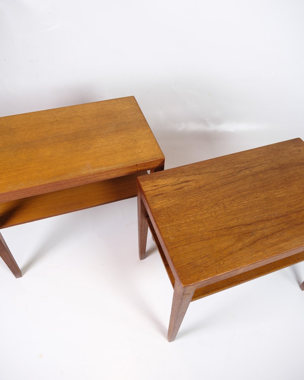 SolgtSæt af 2 sideborde i teak med hylde, designet af Severin Hansen og produceret af Haslev Møbelfabrik i 1960'erne. Bordene har det karakteristiske og præcise snedkerarbejde, som Hansen er kendt for, herunder de smukke, skrå benforbindelser, der elegant møder bordpladen. Den ekstra hylde giver praktisk opbevaringsplads og gør bordene anvendelige både som sideborde og små sofaborde.