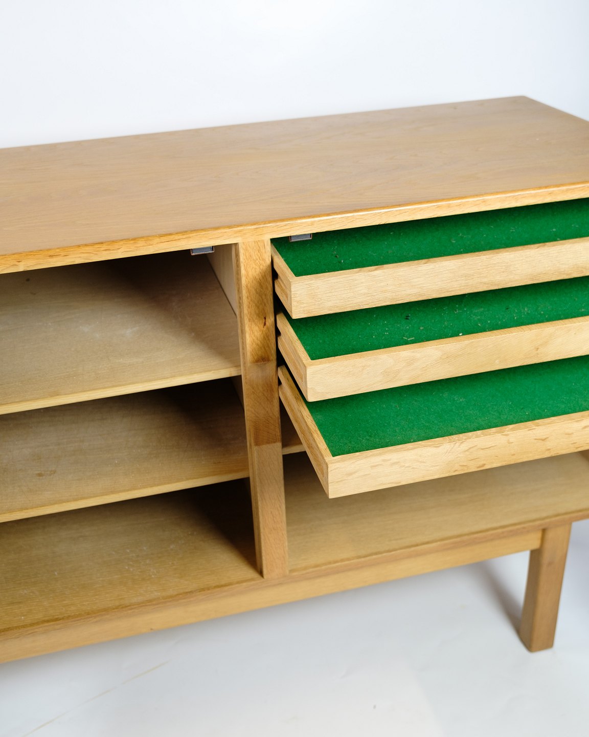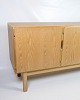 Sideboard in light oak from the 1960s, made in Danish design. The sideboard has three doors that open up to spacious storage compartments with shelves and three pull-out drawers, ideal for storing smaller items. The simple and functional design combines clean lines with quality materials, making the sideboard both practical and stylish.