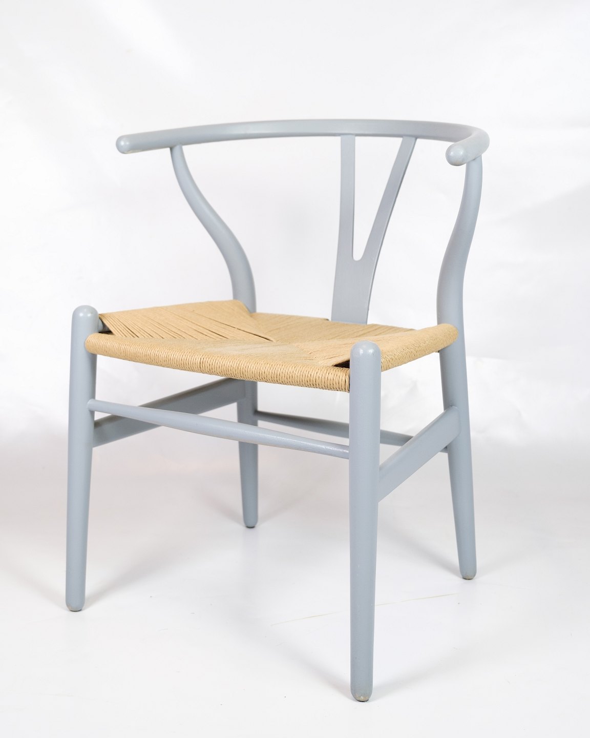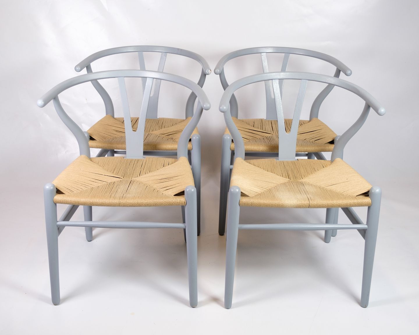 SoldSet of 4 Wishbone chairs, model CH24, designed by Hans J. Wegner and produced by Carl Hansen & Søn. The chairs are painted in a grey colour, which adds a modern expression to the classic design. The wishbone chair, was designed in 1949 and has been in production since 1950.