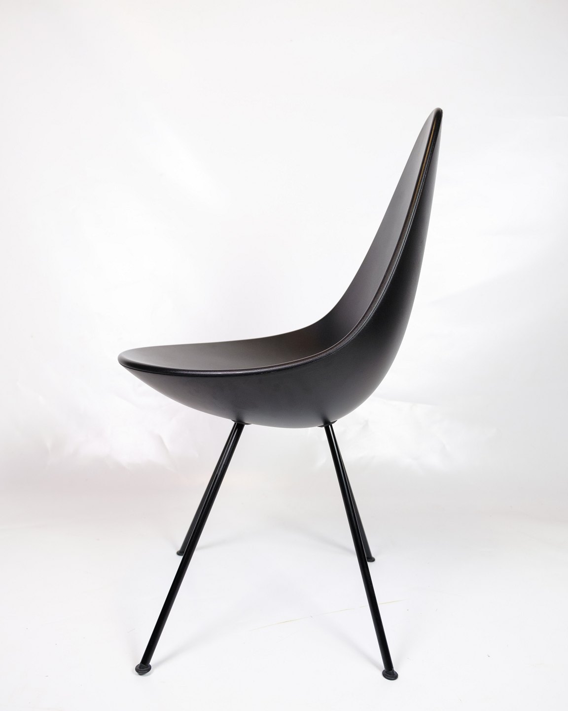 Sæt af 4 spisebordsstole også kaldet "Dråben", model 3110, designet af Arne Jacobsen og fremstillet af Fritz Hansen. Stolene er udført i en plastik skal som er lavet af ABS-plast med nylon som forstærkning indeni for sikre en holdbarhed og kvalitet i stolen.