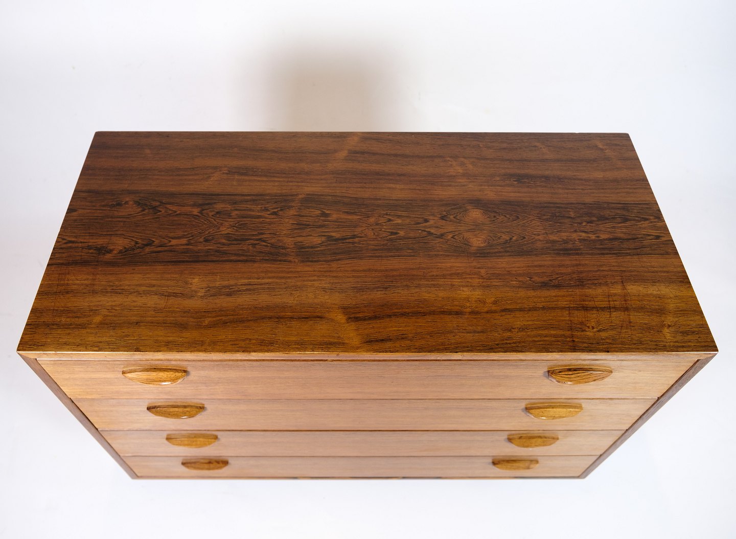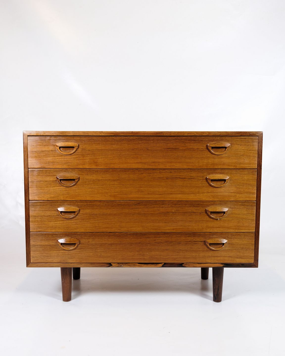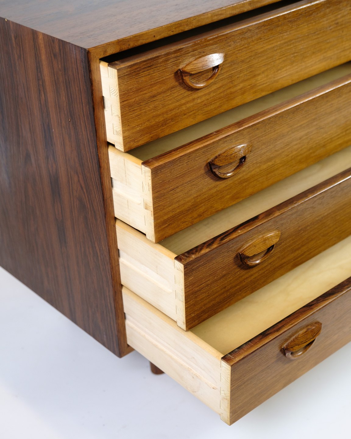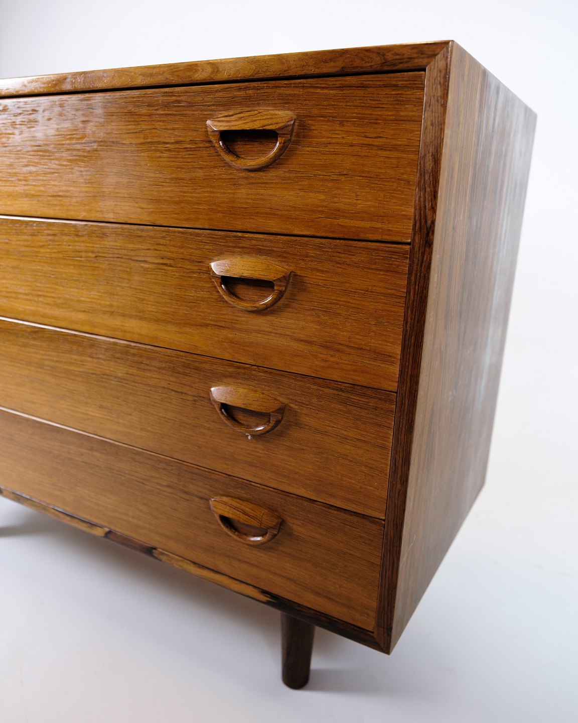 Chest of drawers with 4 drawers and round legs. Made of rosewood from the 1960s and designed by Kai Kristiansen. Kai Kristiansen's design is known for its focus on functionality, simplicity and the craftsmanship of the furniture.