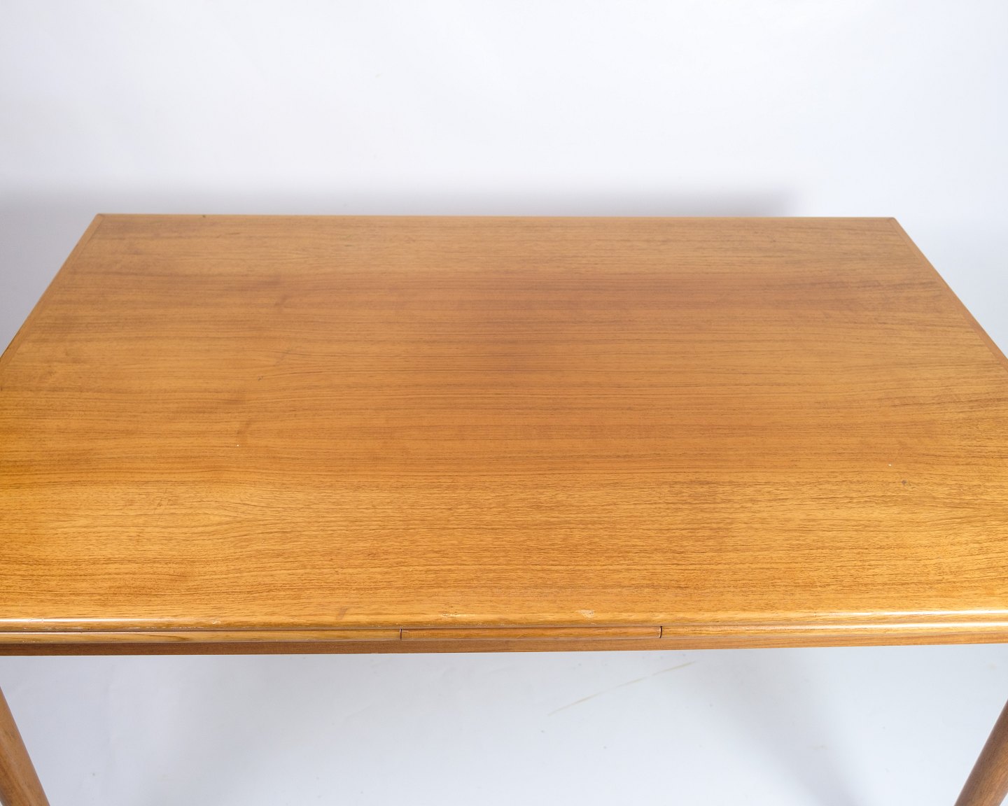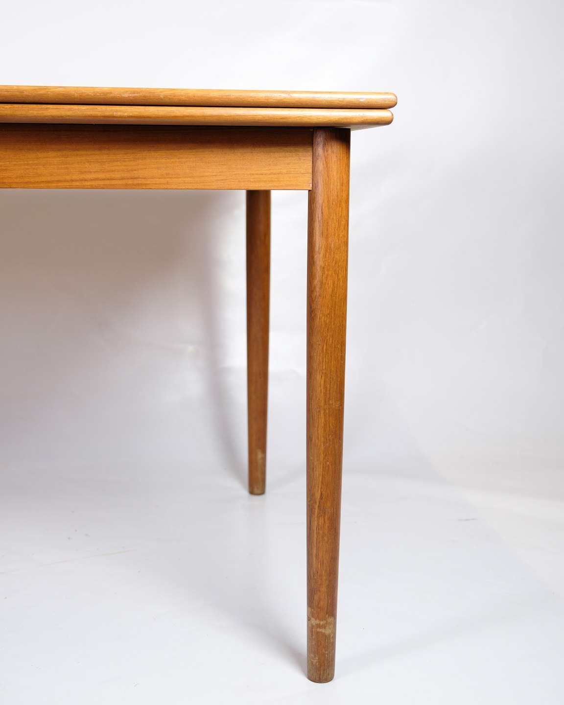 Spisebord med udtræk fra 1960'erne, udført i teak og dansk design. Bordet er designet med rene linjer og en robust konstruktion, typisk for perioden. Det har en udtræksfunktion, der giver mulighed for at tilføje ekstra plader og dermed forlænge bordet, hvilket gør det praktisk til både daglig brug og større sammenkomster.