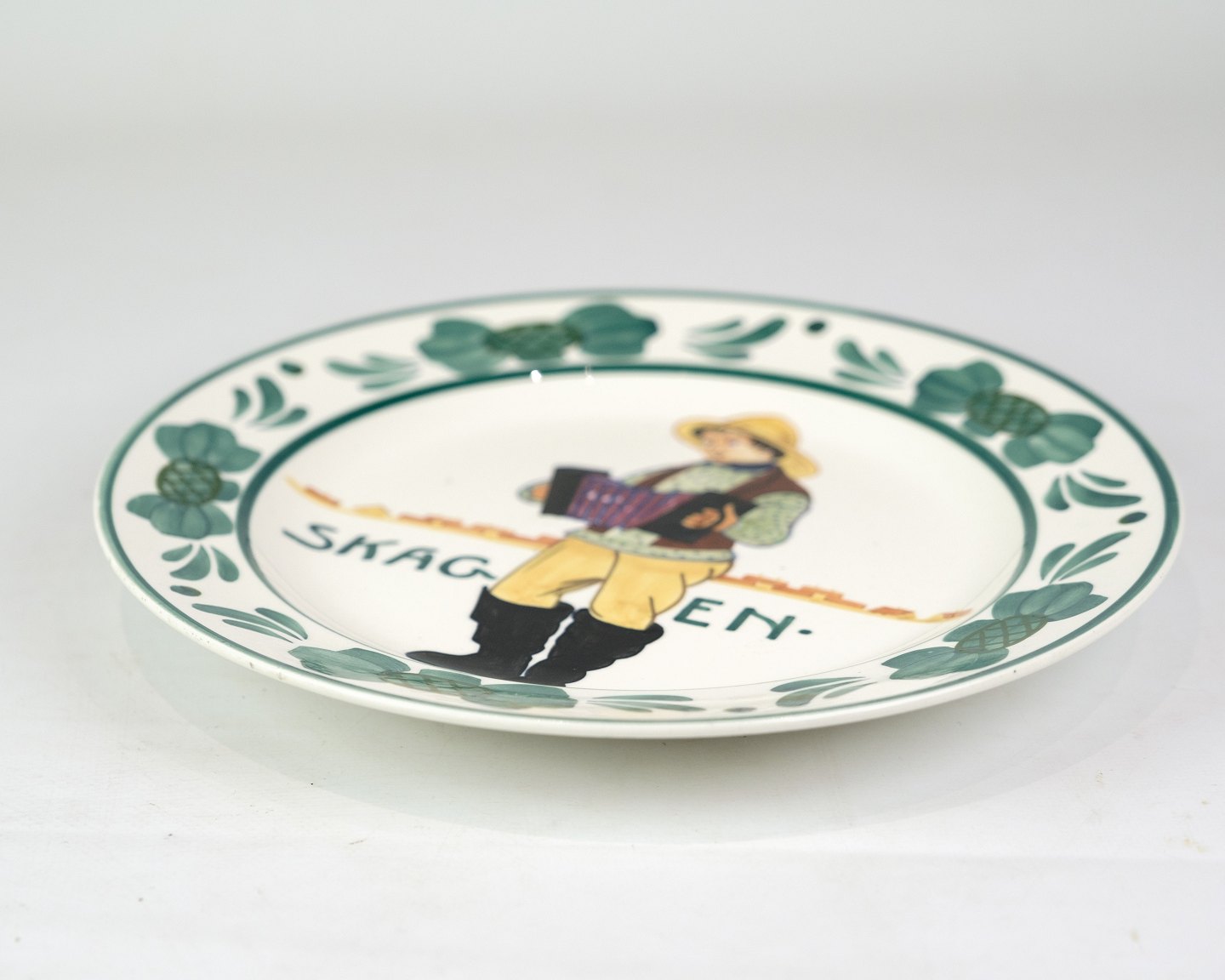 This Skagen plate, model 352/229, is made of earthenware by Aluminia and decorated with a beautiful motif of a man in traditional costume. The design reflects Skagen's rich cultural heritage and craft traditions, making the plate a charming and historically interesting object.