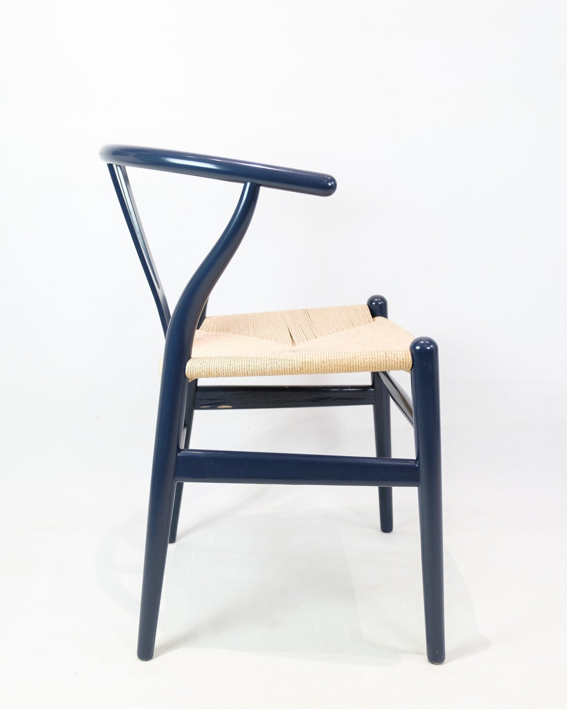 SolgtSæt af 4 Y-stole, model CH24, Designet af Hans J. Wegner og produceret af Carl Hansen & Søn. Stolene er malet i en navy blå farve og sædet er udført i det klassiske naturflet.