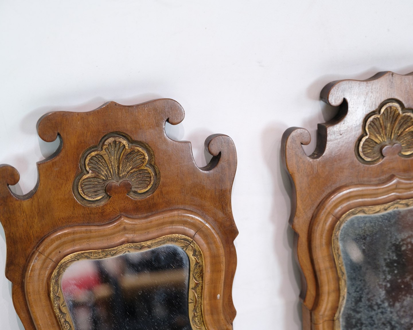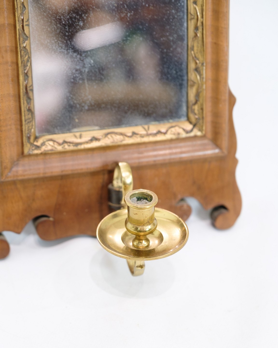 Set of 2 antique wall mirrors with integrated brass candlestick. The frame is made of walnut and the mirrors are made in the rococo style from the 1880s.