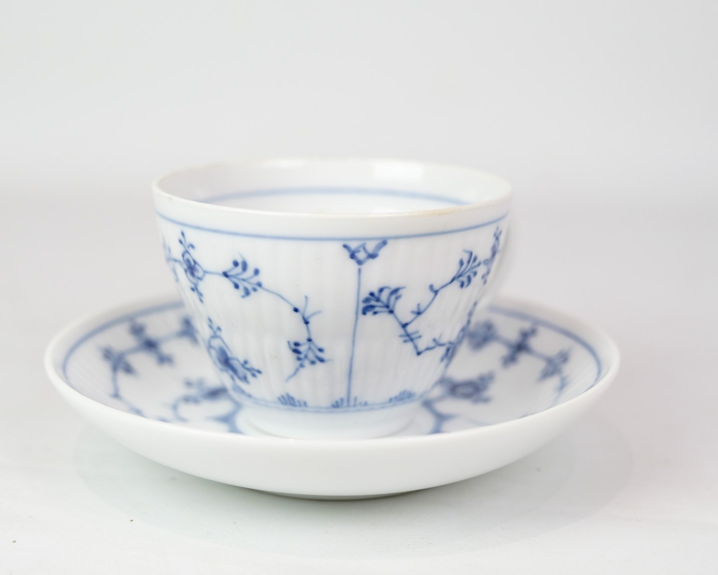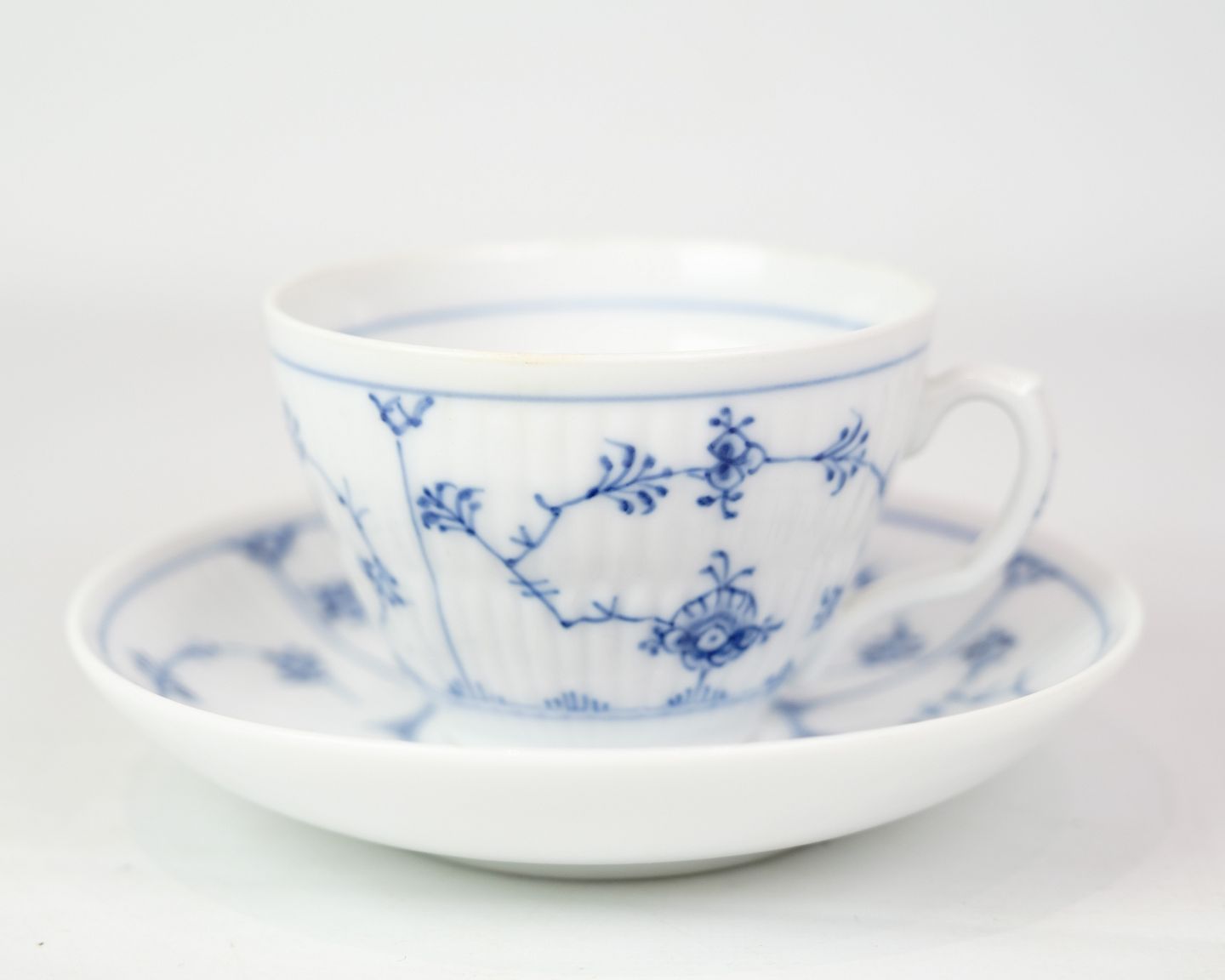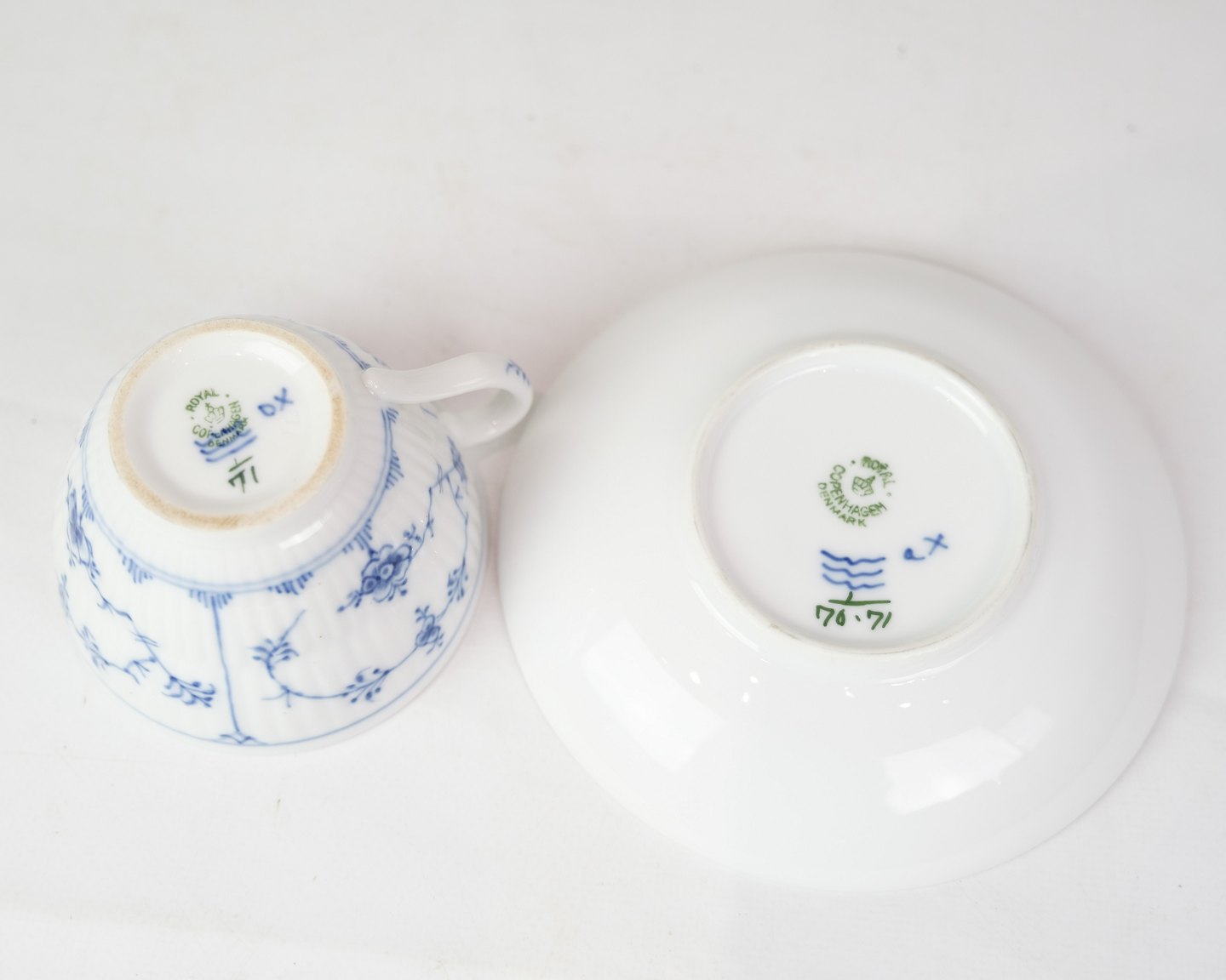 Tekop med underkop mærket 1/71 og 1/70 fra Royal Copenhagen, designet af Arnold Krog. Porcelæn med klassisk musselmalet riflet design. Håndmalet blå dekoration.