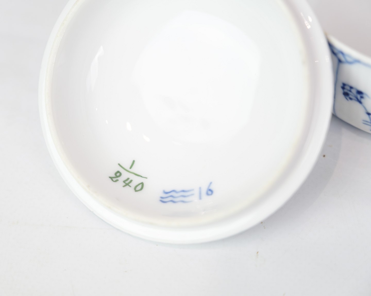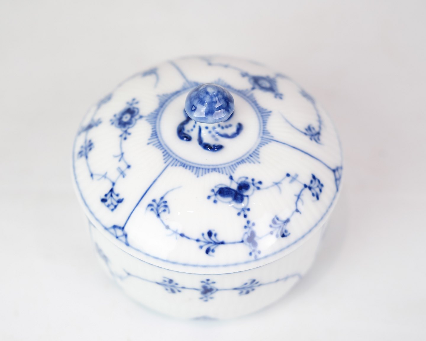 Sjælden skål med låg mærket 1/240 designet af Arnold Krog og fremstillet af Royal Copenhagen. Lavet i porcelæn med musselmalet riflet design. Håndmalet i blå dekoration.