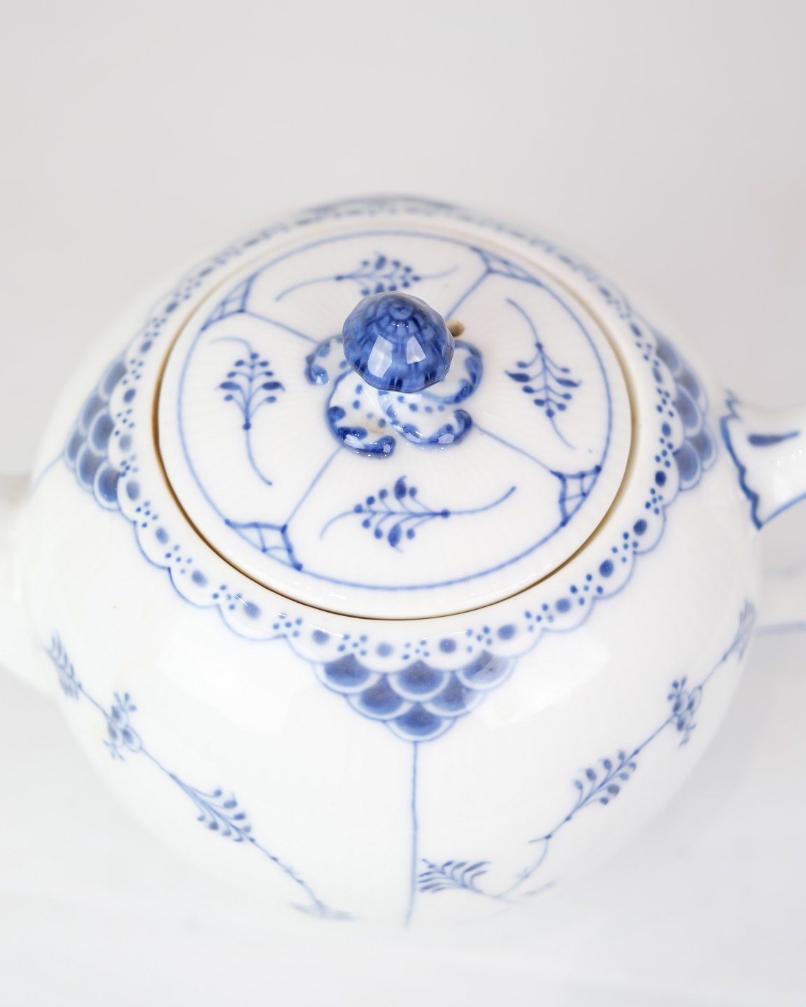 SoldLarge Teapot with Blue Fluted Fluted pattern by Royal Copenhagen model no. 612. Stands with beautiful blue hand-painted pattern.